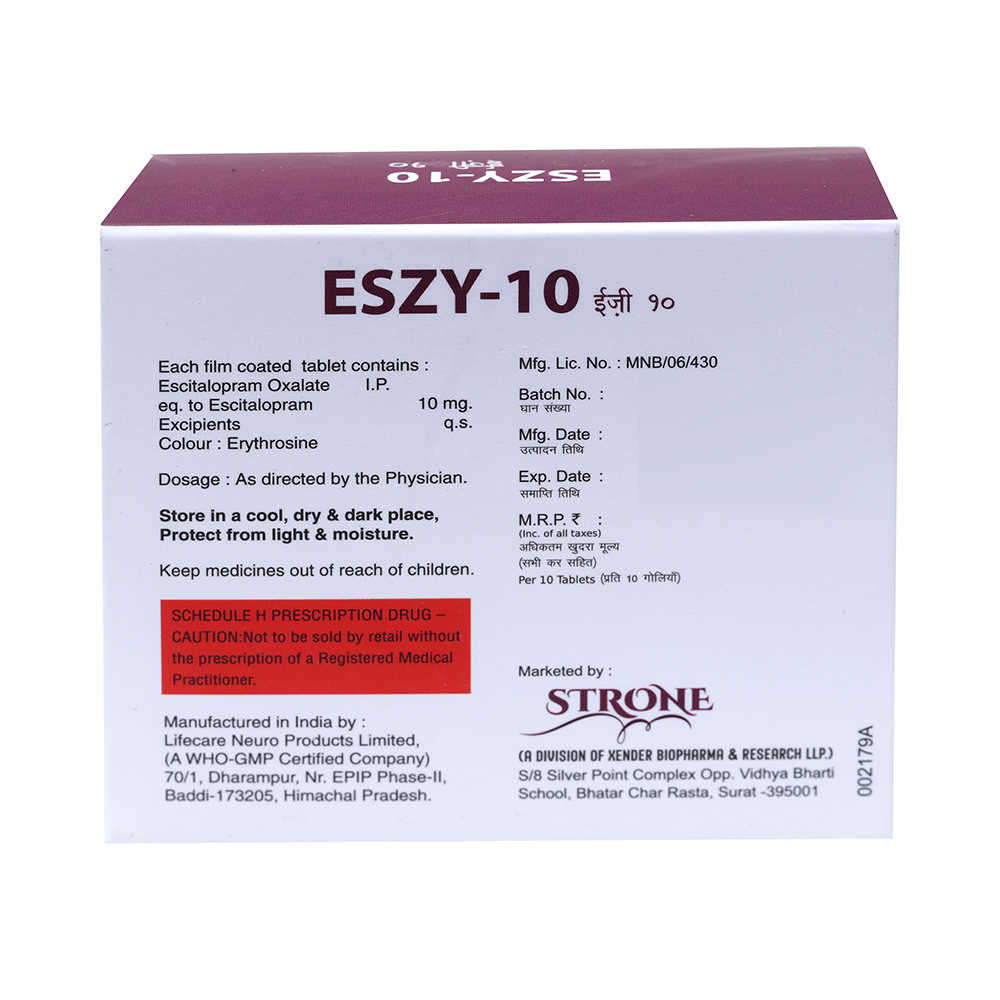 Eszy 10 Tablet is widely prescribed to treat depression and other mental health conditions like anxiety, panic disorder, and obsessive-compulsive disorder. It is a type of antidepressant known as a selective serotonin reuptake inhibitor (SSRI). Eszy 10 Tablet helps recover from depression by improving mood and relieving anxiety and tension. It can be taken with or without food. The dose and how often you need it will be decided by your doctor based on the amount needed to control your symptoms. Your doctor may start you on a lower dose and increase it gradually. Do not change the dose or stop taking it without talking to your doctor, even if you feel well. Doing so may make your condition worse or you may suffer from unpleasant withdrawal symptoms such as anxiety, restlessness, palpitations, dizziness, sleep disturbances.To get the most benefit, take this medicine regularly at the same time each day. Your doctor may advise you to take it in the morning if you have trouble sleeping. It may take a few weeks before you start feeling better. Let your doctor know if you do not see any improvement even after 4 weeks.Some common side effects of this medicine include nausea, fatigue, increased sweating, insomnia (difficulty in sleeping), decreased sexual drive, delayed ejaculation, and women may experience difficulties achieving orgasm. Some people may experience sleepiness after taking this medicine. Let your doctor know straight away if you develop any sudden worsening of mood or any thoughts about harming yourself.Before taking Eszy 10 Tablet, you should tell your doctor if you have epilepsy (seizure disorder or fits), diabetes, liver or kidney disease, any heart problems, or are currently taking medicines for depression known as MAO inhibitors. These may affect your treatment. Please tell your doctor about all the medicines you are taking to make sure you are safe.