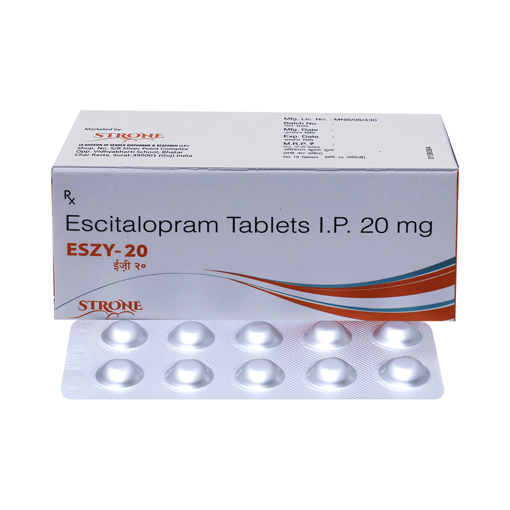 Eszy 20 Tablet is widely prescribed to treat depression and other mental health conditions like anxiety, panic disorder, and obsessive-compulsive disorder. It is a type of antidepressant known as a selective serotonin reuptake inhibitor (SSRI). Eszy 20 Tablet helps recover from depression by improving mood and relieving anxiety and tension. It can be taken with or without food. The dose and how often you need it will be decided by your doctor based on the amount needed to control your symptoms. Your doctor may start you on a lower dose and increase it gradually. Do not change the dose or stop taking it without talking to your doctor, even if you feel well. Doing so may make your condition worse or you may suffer from unpleasant withdrawal symptoms such as anxiety, restlessness, palpitations, dizziness, sleep disturbances.To get the most benefit, take this medicine regularly at the same time each day. Your doctor may advise you to take it in the morning if you have trouble sleeping. It may take a few weeks before you start feeling better. Let your doctor know if you do not see any improvement even after 4 weeks.Some common side effects of this medicine include nausea, fatigue, increased sweating, insomnia (difficulty in sleeping), decreased sexual drive, delayed ejaculation, and women may experience difficulties achieving orgasm. Some people may experience sleepiness after taking this medicine. Let your doctor know straight away if you develop any sudden worsening of mood or any thoughts about harming yourself.Before taking Eszy 20 Tablet, you should tell your doctor if you have epilepsy (seizure disorder or fits), diabetes, liver or kidney disease, any heart problems, or are currently taking medicines for depression known as MAO inhibitors. These may affect your treatment. Please tell your doctor about all the medicines you are taking to make sure you are safe.