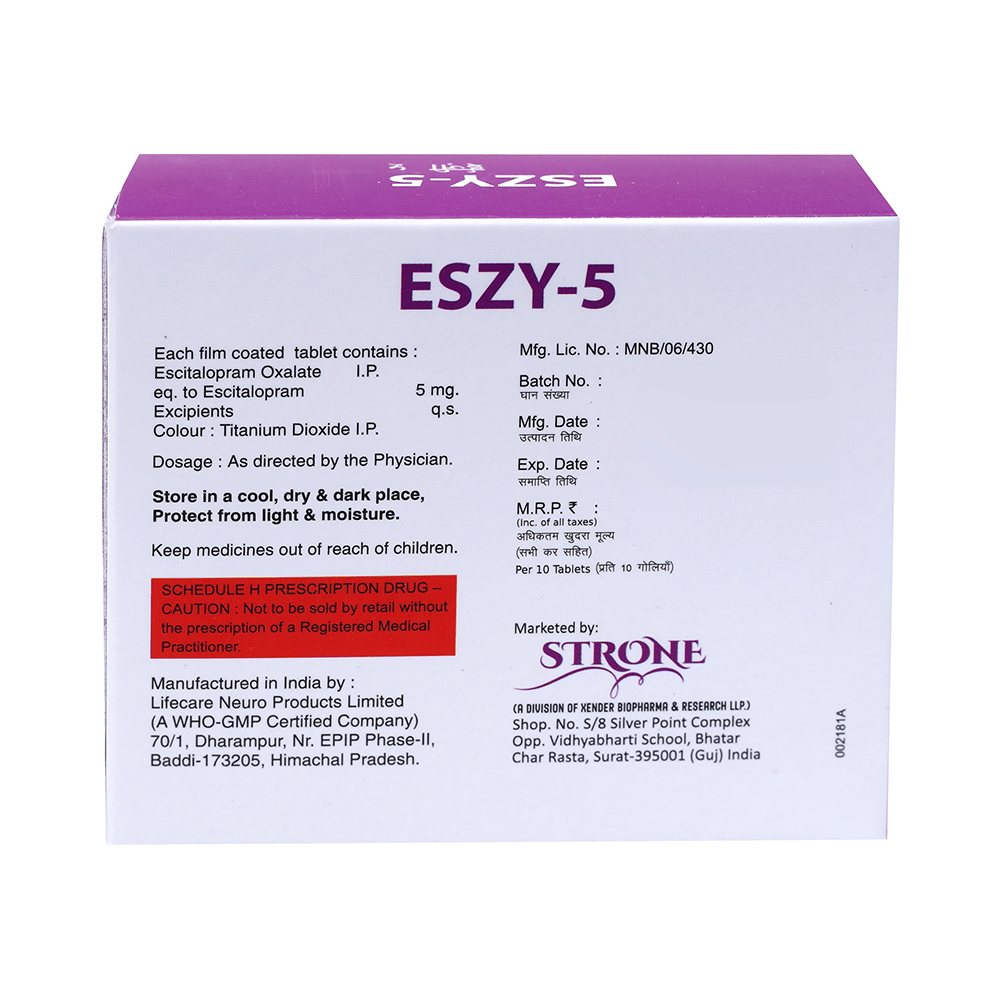 Eszy 5 Tablet is widely prescribed to treat depression and other mental health conditions like anxiety, panic disorder, and obsessive-compulsive disorder. It is a type of antidepressant known as a selective serotonin reuptake inhibitor (SSRI). Eszy 5 Tablet helps recover from depression by improving mood and relieving anxiety and tension. It can be taken with or without food. The dose and how often you need it will be decided by your doctor based on the amount needed to control your symptoms. Your doctor may start you on a lower dose and increase it gradually. Do not change the dose or stop taking it without talking to your doctor, even if you feel well. Doing so may make your condition worse or you may suffer from unpleasant withdrawal symptoms such as anxiety, restlessness, palpitations, dizziness, sleep disturbances.To get the most benefit, take this medicine regularly at the same time each day. Your doctor may advise you to take it in the morning if you have trouble sleeping. It may take a few weeks before you start feeling better. Let your doctor know if you do not see any improvement even after 4 weeks.Some common side effects of this medicine include nausea, fatigue, increased sweating, insomnia (difficulty in sleeping), decreased sexual drive, delayed ejaculation, and women may experience difficulties achieving orgasm. Some people may experience sleepiness after taking this medicine. Let your doctor know straight away if you develop any sudden worsening of mood or any thoughts about harming yourself.Before taking Eszy 5 Tablet, you should tell your doctor if you have epilepsy (seizure disorder or fits), diabetes, liver or kidney disease, any heart problems, or are currently taking medicines for depression known as MAO inhibitors. These may affect your treatment. Please tell your doctor about all the medicines you are taking to make sure you are safe.