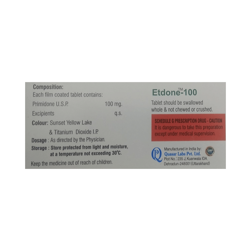 Etdone 100 Tablet belongs to a class of medicines called barbiturates. It is used to treat and prevent epilepsy (seizures). They also have hypnotic properties. This means, they slow down the activity of the brain and can make you feel sleepy or dizzy. Etdone 100 Tablet may be taken with or without food. However, it is advised to take it at the same time each day as this helps to maintain a consistent level of medicine in the body. Take this medicine in the dose and duration as advised by your doctor as it may be habit-forming with long-term use. If you have missed a dose, take it as soon as you remember it. Do not skip any doses and finish the full course of treatment even if you feel better.Some common side effects of this medicine include nausea, vomiting, vertigo, low energy, impaired coordination, visual disturbance, and headache. It may also cause dizziness and sleepiness, so do not drive or do anything that requires mental focus until you know how this medicine affects you.Remember to consult your doctor if you notice severe rashes, especially accompanied by fever after taking this medicine. It should be noted that long-term use of this medicine can cause pain in joints also.