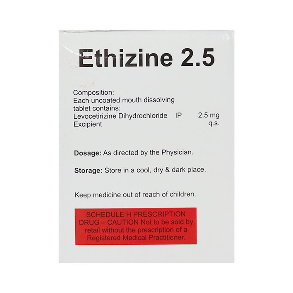 Ethizine 2.5 Tablet MD is given to children to treat a wide range of symptoms caused due to allergic conditions like hay fever, urticaria (hives), conjunctivitis (red, itchy eye), and common cold. These symptoms may include watery eyes, runny nose, sneezing, and itching. Ethizine 2.5 Tablet MD can be taken with or without food. The dose required by you may vary depending on what you are taking it for. This medicine is usually taken in the evening, but follow the advice of your doctor on how to take it. You may need this medicine only on days you have symptoms, but if you are taking it to prevent the symptoms then you should take it regularly. If you miss doses or stop taking it earlier than advised, your symptoms may come back.This medicine is generally very safe. The most common side effects include feeling sleepy or dizzy, dry mouth, fatigue, and headache. These are usually mild and go away after a couple of days as your body adjusts to it. Consult your doctor if any of the side effects persist or worry you.Before taking it, tell your doctor if you have any kidney problems or epilepsy (seizures). Your dose may need to be modified or this medicine may not suit you. Some other medicines can interact with this medicine so let your healthcare team know what else you are taking. You should also talk to your doctor before using this medicine if you are pregnant or breastfeeding, although it is not thought to be harmful.