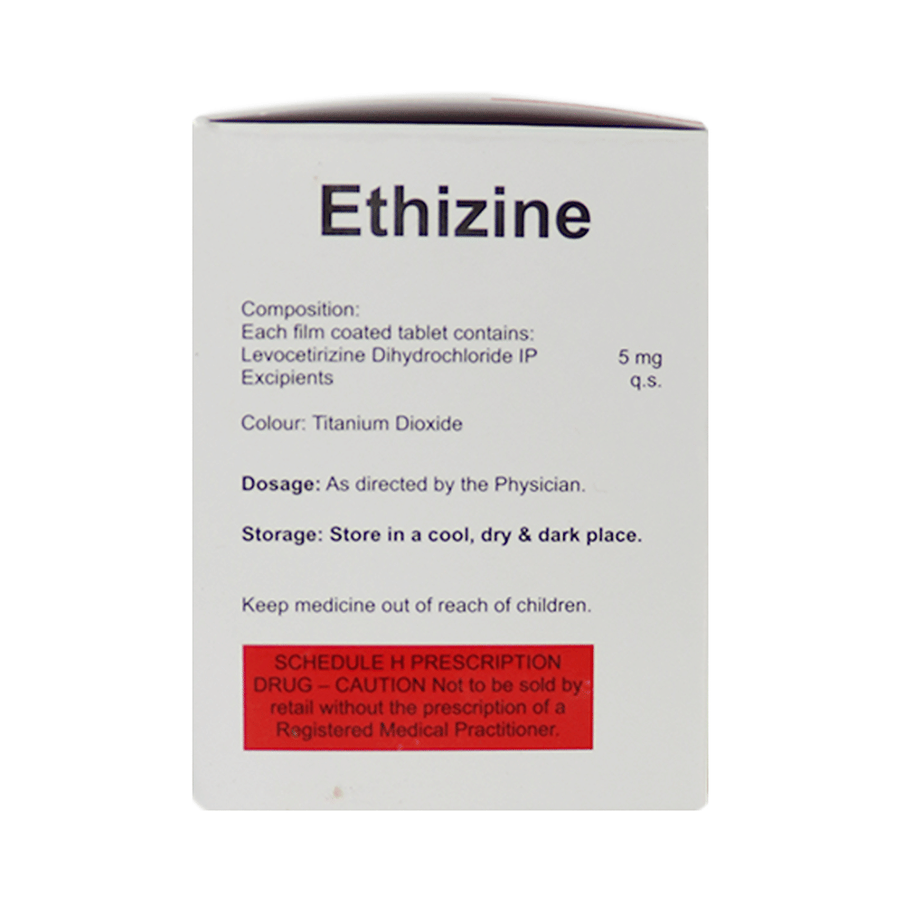 Ethizine Tablet belongs to a group of medicines called antihistamines. It is used to treat various allergic conditions such as hay fever, conjunctivitis, some skin reactions such as eczema, hives, and reactions to bites and stings. It also relieves watery eyes, runny nose, sneezing, and itching. Ethizine Tablet can be taken with or without food. The dose required by you may vary depending on what you are taking it for. This medicine is usually taken in the evening, but follow the advice of your doctor on how to take it. You may need this medicine only on days you have symptoms, but if you are taking it to prevent the symptoms then you should take it regularly. If you miss doses or stop taking it earlier than advised, your symptoms may come back.Common side effects include somnolence (sleepiness), dry mouth, fatigue, fever, cough, nasopharyngitis, and nosebleed. These are usually mild and go away after a couple of days as your body adjusts to it. Consult your doctor if any of the side effects persist or worry you.Before taking it, tell your doctor if you have any kidney problems or epilepsy (seizures). Your dose may need to be modified or this medicine may not suit you. Some other medicines can interact with this medicine so let your healthcare team know what else you are taking. You should also talk to your doctor before using this medicine if you are pregnant or breastfeeding, although it is not thought to be harmful.