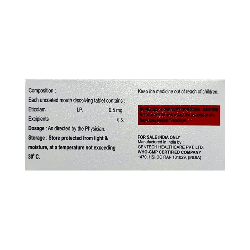Etikind 0.5 Tablet MD is a prescription medicine used to treat short-term anxiety and insomnia. It binds to specific receptor sites in the brain and calms the brain. Therefore, it provides effective relaxation to the brain. Etikind 0.5 Tablet MD may be taken with or without food. However, take it at the same time each day, as this helps maintain a consistent level of medicine in the body. Take this medicine in the dose and duration as advised by your doctor, as it has a high potential for habit-forming. Finish the full course of treatment, even if you feel better. You should not stop this medication without talking to your doctor.Some common side effects of this medicine include headaches, sleepiness, vomiting, yawning, and dry mouth. It may cause dizziness and sleepiness, so do not drive or do anything that requires mental focus until you know how this medicine affects you. Talk to your doctor about potential side effects and ways you might prevent or cope with them. You may also get side effects after stopping the treatment.Before taking the medicine, you should tell your doctor if you are pregnant, planning to become pregnant, or breastfeeding. Etikind 0.5 Tablet MD can usually be mixed safely with other medicines, but some medicines, and alcohol, do affect the way it works and can increase the chance of side effects. If you have been taking this medicine for a long time, then regular monitoring of blood and liver functions may be required.