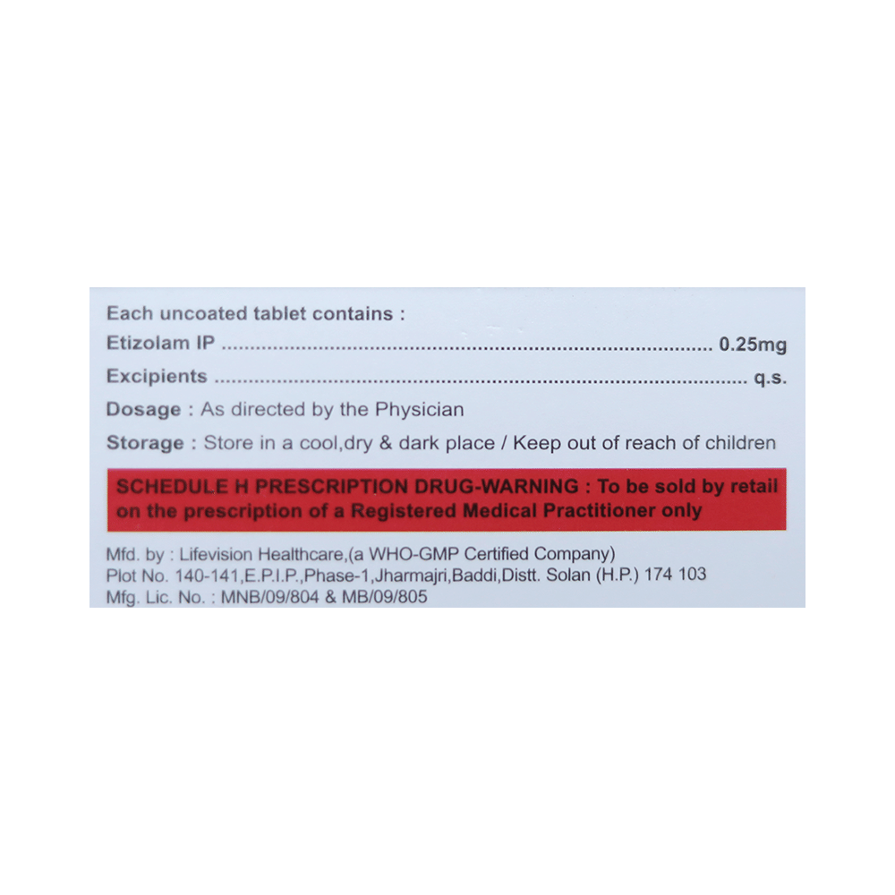 In Treatment of InsomniaEtinite 0.25 Tablet helps treat insomnia (difficulty falling or staying asleep) in people who have problems related to their sleeping habits. Insomnia may cause you to wake up earlier than usual and you may find it difficult to go back to sleep. Etinite 0.25 Tablet works by slowing activity in the brain to allow sleep. This helps you relax and feel more energetic. It also helps you concentrate better and improves your quality of life.In Treatment of Short term anxietyEtinite 0.25 Tablet reduces the symptoms of excessive anxiety and worry that are triggered only at the time of stressful conditions that last for a shorter duration. These could be job interviews, exams, stage performances, etc. It can effectively manage feelings of restlessness, tiredness, difficulty concentrating and feeling irritable. Etinite 0.25 Tablet will therefore help you go about your daily activities more easily and be more productive. Keep taking this medicine even if you feel well. Stopping suddenly can cause serious problems.show moreshow less
