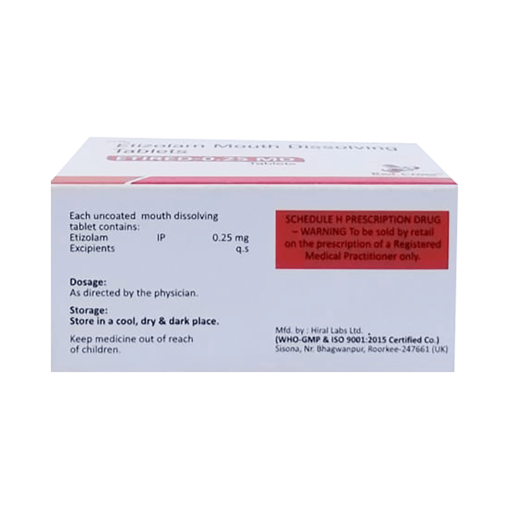 Etired 0.25 MD Tablet is a prescription medicine used to treat short-term anxiety and insomnia. It binds to specific receptor sites in the brain and calms the brain. Therefore, it provides effective relaxation to the brain. Etired 0.25 MD Tablet may be taken with or without food. However, take it at the same time each day, as this helps maintain a consistent level of medicine in the body. Take this medicine in the dose and duration as advised by your doctor, as it has a high potential for habit-forming. Finish the full course of treatment, even if you feel better. You should not stop this medication without talking to your doctor.Some common side effects of this medicine include headaches, sleepiness, vomiting, yawning, and dry mouth. It may cause dizziness and sleepiness, so do not drive or do anything that requires mental focus until you know how this medicine affects you. Talk to your doctor about potential side effects and ways you might prevent or cope with them. You may also get side effects after stopping the treatment.Before taking the medicine, you should tell your doctor if you are pregnant, planning to become pregnant, or breastfeeding. Etired 0.25 MD Tablet can usually be mixed safely with other medicines, but some medicines, and alcohol, do affect the way it works and can increase the chance of side effects. If you have been taking this medicine for a long time, then regular monitoring of blood and liver functions may be required.