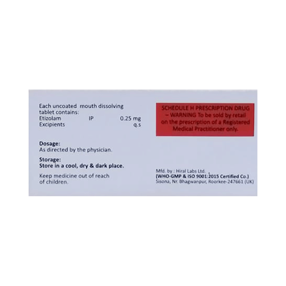 In Treatment of InsomniaEtired 0.25 MD Tablet helps treat insomnia (difficulty falling or staying asleep) in people who have problems related to their sleeping habits. Insomnia may cause you to wake up earlier than usual and you may find it difficult to go back to sleep. Etired 0.25 MD Tablet works by slowing activity in the brain to allow sleep. This helps you relax and feel more energetic. It also helps you concentrate better and improves your quality of life.In Treatment of Short term anxietyEtired 0.25 MD Tablet reduces the symptoms of excessive anxiety and worry that are triggered only at the time of stressful conditions that last for a shorter duration. These could be job interviews, exams, stage performances, etc. It can effectively manage feelings of restlessness, tiredness, difficulty concentrating and feeling irritable. Etired 0.25 MD Tablet will therefore help you go about your daily activities more easily and be more productive. Keep taking this medicine even if you feel well. Stopping suddenly can cause serious problems.show moreshow less
