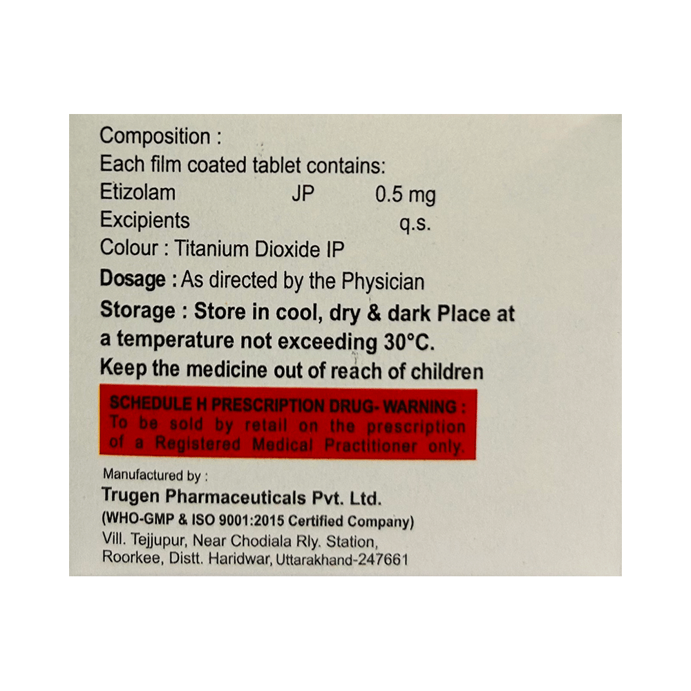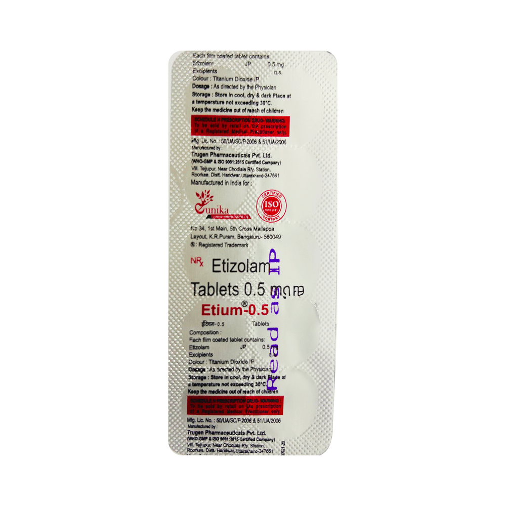 In Treatment of InsomniaEtium 0.5 Tablet helps treat insomnia (difficulty falling or staying asleep) in people who have problems related to their sleeping habits. Insomnia may cause you to wake up earlier than usual and you may find it difficult to go back to sleep. Etium 0.5 Tablet works by slowing activity in the brain to allow sleep. This helps you relax and feel more energetic. It also helps you concentrate better and improves your quality of life.In Treatment of Short term anxietyEtium 0.5 Tablet reduces the symptoms of excessive anxiety and worry that are triggered only at the time of stressful conditions that last for a shorter duration. These could be job interviews, exams, stage performances, etc. It can effectively manage feelings of restlessness, tiredness, difficulty concentrating and feeling irritable. Etium 0.5 Tablet will therefore help you go about your daily activities more easily and be more productive. Keep taking this medicine even if you feel well. Stopping suddenly can cause serious problems.show moreshow less