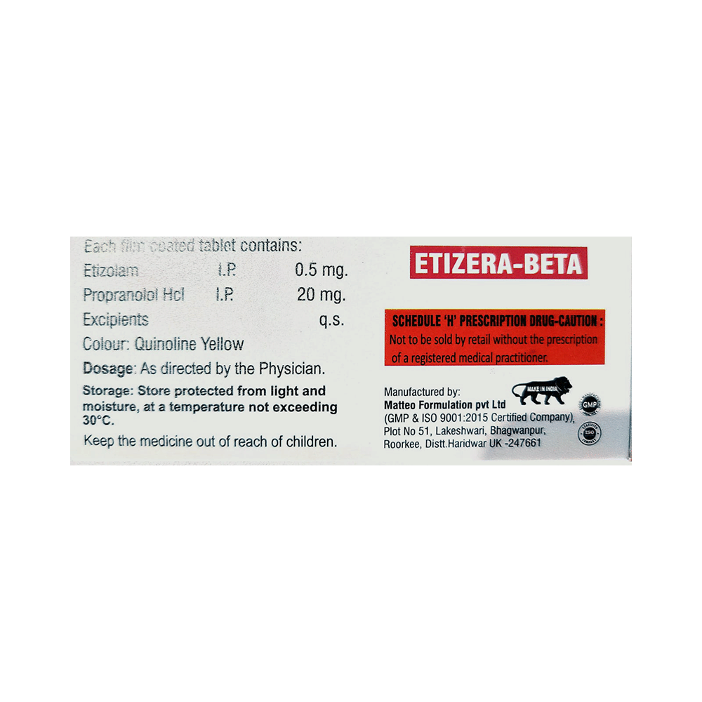Etizera-Beta Tablet is a prescription medicine used to treat anxiety disorder. It calms the brain by decreasing the abnormal and excessive activity of the nerve cells. It also blocks the action of certain chemical messengers of the heart and blood vessels. Etizera-Beta Tablet should be taken on an empty stomach. However, it is advised to take it at the same time each day as this helps to maintain a consistent level of medicine in the body. Take this medicine in the dose and duration advised by your doctor as it has high habit-forming potential. If you miss a dose of this medicine, take it as soon as you remember. Finish the full course of treatment even if you feel better. It is important not to stop taking this medicine suddenly as it may cause withdrawal symptoms. Avoid consuming alcohol while taking this medicine as this may reduce its effectiveness.Some common side effects of this medicine include confusion, memory impairment, slow heart rate, tiredness, and nightmare. It may also cause dizziness and sleepiness. So, do not drive or do anything that requires mental focus until you know how this medicine affects you. Let your doctor know if you experience increased swelling around your legs or ankles, sudden weight gain or sudden shortness of breath while on the treatment.Take caution while taking medicine if you are suffering from liver disease. Your doctor should also know about all other medicines you are taking as many of these may make this medicine less effective or change the way it works. Inform your doctor if you are pregnant, planning pregnancy or breastfeeding.