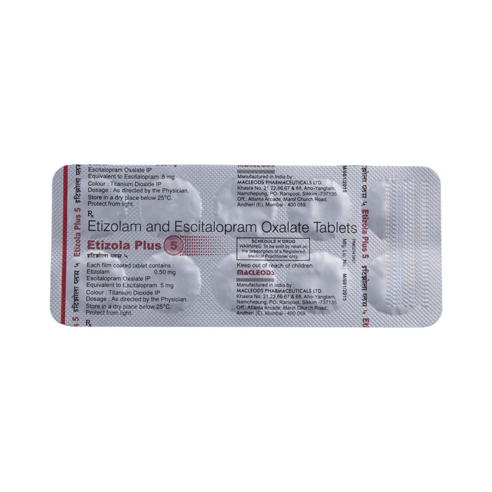Etizola Plus 5 Tablet is a prescription medicine used to treat depression. It is a combination medicine that calms the brain by decreasing the abnormal and excessive activity of the nerve cells. It also increases the level of chemical messenger in the brain which improves mood. Etizola Plus 5 Tablet can be taken with or without food. However, it is advised to take it at the same time each day as this helps to maintain a consistent level of medicine in the body. Take this medicine in the dose and duration advised by your doctor as it has habit-forming potential. If you miss a dose of this medicine, take it as soon as you remember. Finish the full course of treatment even if you feel better. It is important not to stop taking this medicine suddenly as this may cause withdrawal symptoms.Some common side effects of this medicine include nausea, vomiting, diarrhea, confusion, memory impairment, low sexual desire, and delayed ejaculation. It may also cause dizziness and sleepiness. So, do not drive or do anything that requires mental focus until you know how this medicine affects you. Remember to inform your doctor if you develop any unusual changes in mood as it can cause suicidal thoughts and can be dangerous for you. This medicine may cause weight gain and to control it, you should have a balanced diet and exercise regularly.Take caution while taking medicine if you are suffering from liver disease. Your doctor should also know about all other medicines you are taking as many of these may make this medicine less effective or change the way it works. Inform your doctor if you are pregnant, planning pregnancy or breastfeeding.