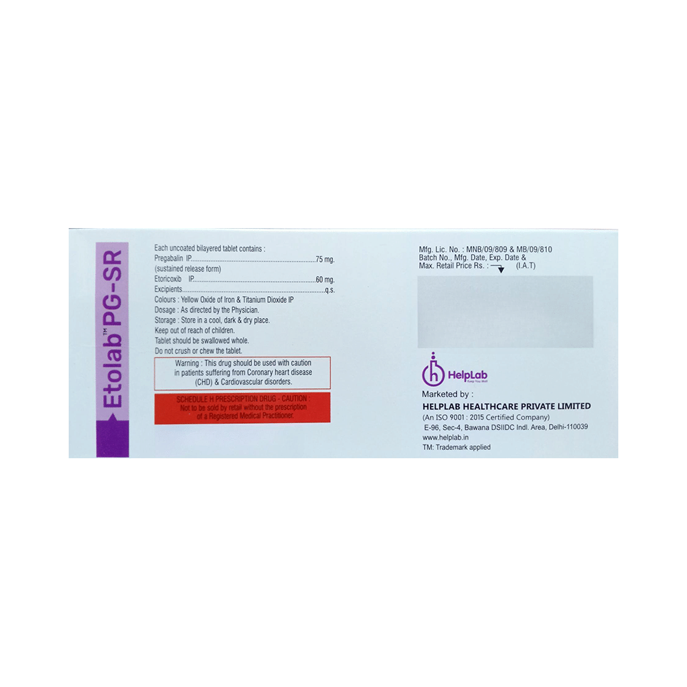 Etolab PG-SR Tablet is a combination of two medicines: Pregabalin and Etoricoxib. Pregabalin is an antiepileptic medication and belives to block pain by interfering with pain signals traveling through the damaged nerves and the brain. Etoricoxib is a non-steroidal anti-inflammatory drug (NSAID) called COX-2 inhibitors. It works by blocking the release of certain chemical messengers that are responsible for pain and inflammation (redness and swelling).
