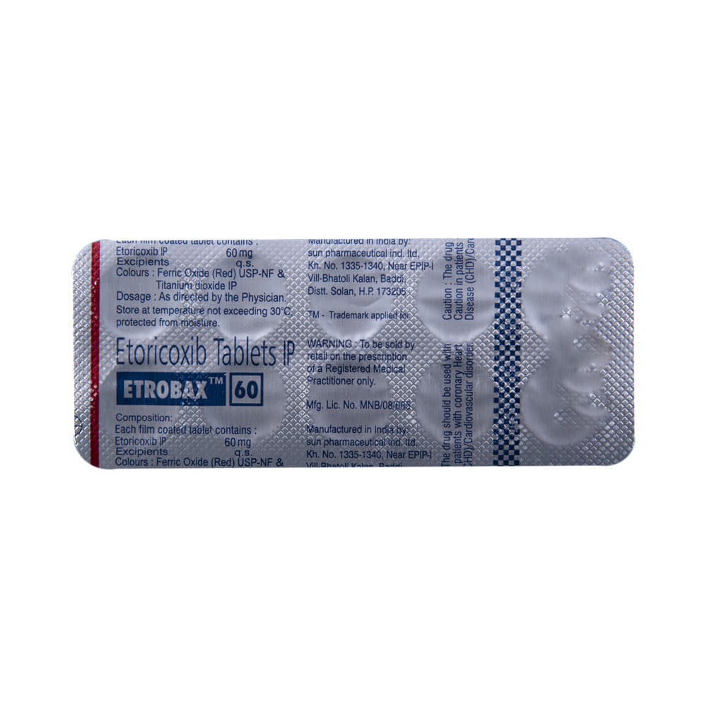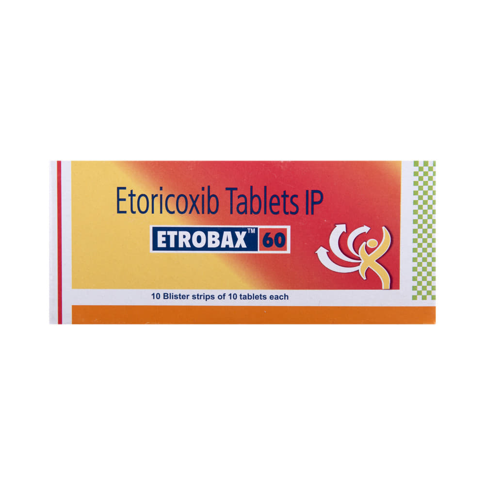 Etrobax 60 Tablet is a pain-relieving medicine. It is used for relieving moderate pain and swelling of joints associated with different forms of gout and arthritis. It is also used for short-term treatment of moderate pain after dental surgery. Etrobax 60 Tablet can be taken with or without food. The dose depends on what you are taking it for and how well it helps your symptoms. You should take it as advised by your doctor. Do not take more or use it for longer than recommended.The most common side effects of this medicine include stomach pain, heartburn, nausea, edema, dizziness, headache, and discoloration of the skin. These are not usually serious, but if you are worried, ask your doctor about ways of reducing or preventing them.Before taking it, you should let your doctor know if you have a history of ulcers or bleeding in your stomach, high blood pressure, or any trouble with your heart, kidneys, or liver. Let your doctor also know about all the other medicines you are taking because they may affect, or be affected by, this medicine. Pregnant or breastfeeding women should consult their doctor before starting treatment.