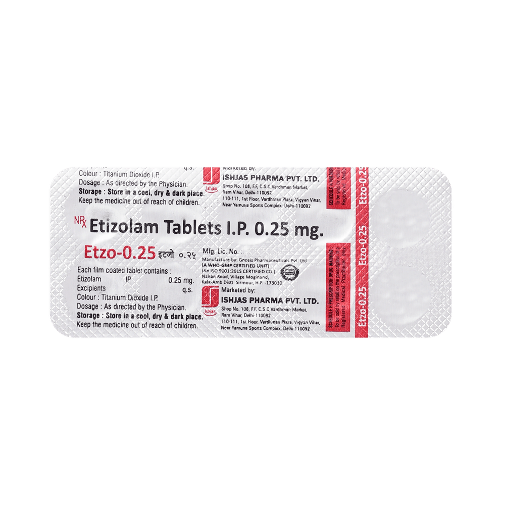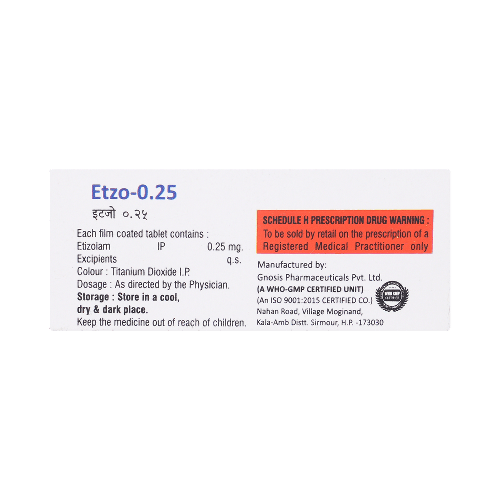Etzo 0.25mg Tablet is a prescription medicine used to treat short-term anxiety and insomnia. It binds to specific receptor sites in the brain and calms the brain. Therefore, it provides effective relaxation to the brain. Etzo 0.25mg Tablet may be taken with or without food. However, take it at the same time each day, as this helps maintain a consistent level of medicine in the body. Take this medicine in the dose and duration as advised by your doctor, as it has a high potential for habit-forming. Finish the full course of treatment, even if you feel better. You should not stop this medication without talking to your doctor.Some common side effects of this medicine include headaches, sleepiness, vomiting, yawning, and dry mouth. It may cause dizziness and sleepiness, so do not drive or do anything that requires mental focus until you know how this medicine affects you. Talk to your doctor about potential side effects and ways you might prevent or cope with them. You may also get side effects after stopping the treatment.Before taking the medicine, you should tell your doctor if you are pregnant, planning to become pregnant, or breastfeeding. Etzo 0.25mg Tablet can usually be mixed safely with other medicines, but some medicines, and alcohol, do affect the way it works and can increase the chance of side effects. If you have been taking this medicine for a long time, then regular monitoring of blood and liver functions may be required.
