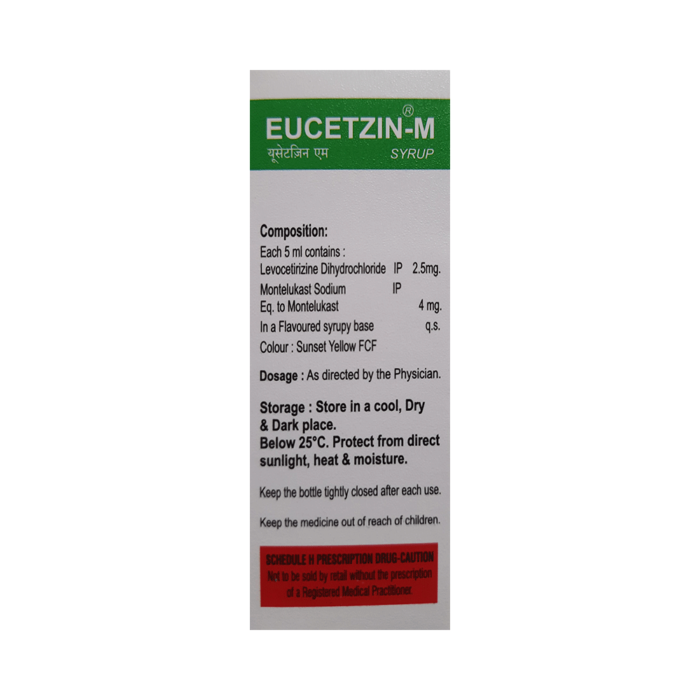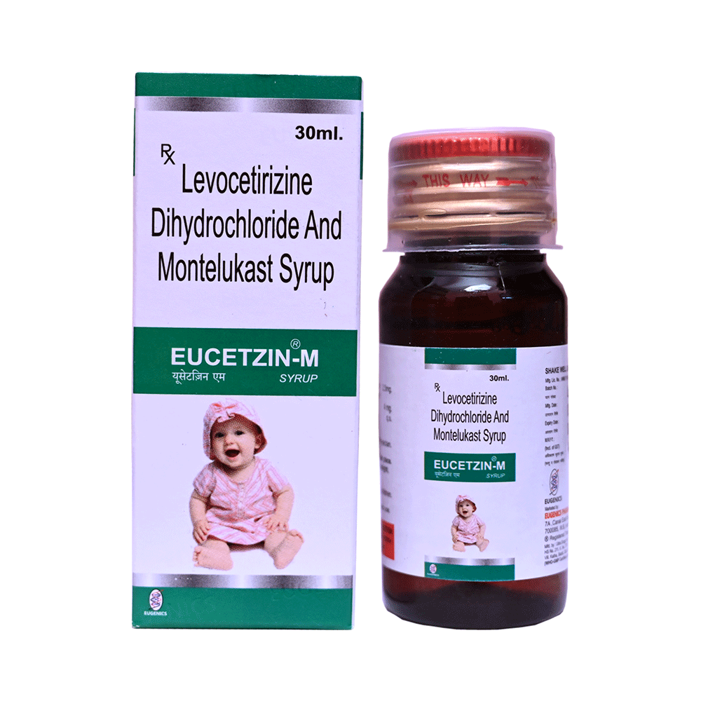 Eucetzin-M Syrup is commonly prescribed in children to treat symptoms of allergy such as runny nose, sneezing, itching, swelling, congestion, and watery eyes. It may also help in the treatment of asthma and skin allergies. Give this medicine to your child at a fixed time before or after food in the prescribed dose, time, and way. For asthma, prefer giving Eucetzin-M Syrup in the evening or 2 hours before physical activity. For allergy, it is best to give it either in the morning or in the evening, depending upon the time of onset of symptoms. In case your child has both, prefer giving it in the evening. If your child vomits within 30 minutes of taking this medicine, give the same dose again, but skip it if it’s already time for the next dose.Your child may start to feel better after a few regular doses. However, you must still complete the prescribed dose to ensure maximum benefit. Moreover, stopping the medicine abruptly may worsen your child’s condition. This medicine may cause some minor and temporary side effects like vomiting, diarrhea, nausea, dizziness, dry mouth, rash, and headache. Usually, these episodes subside once your child’s body adapts to the medicine. However, in case these effects persist or start bothering your child, consult your child’s doctor without any delay.Let your child’s doctor know if your child is already taking any medicines. Also, narrate your child’s complete medical history, including any prior episodes of allergy, heart problem, blood disorder, vascular disorders, birth defects, airway obstruction, lung anomaly, skin disorder, liver impairment, and kidney malfunction. This information is critical for dose alterations and in planning your child’s overall treatment.