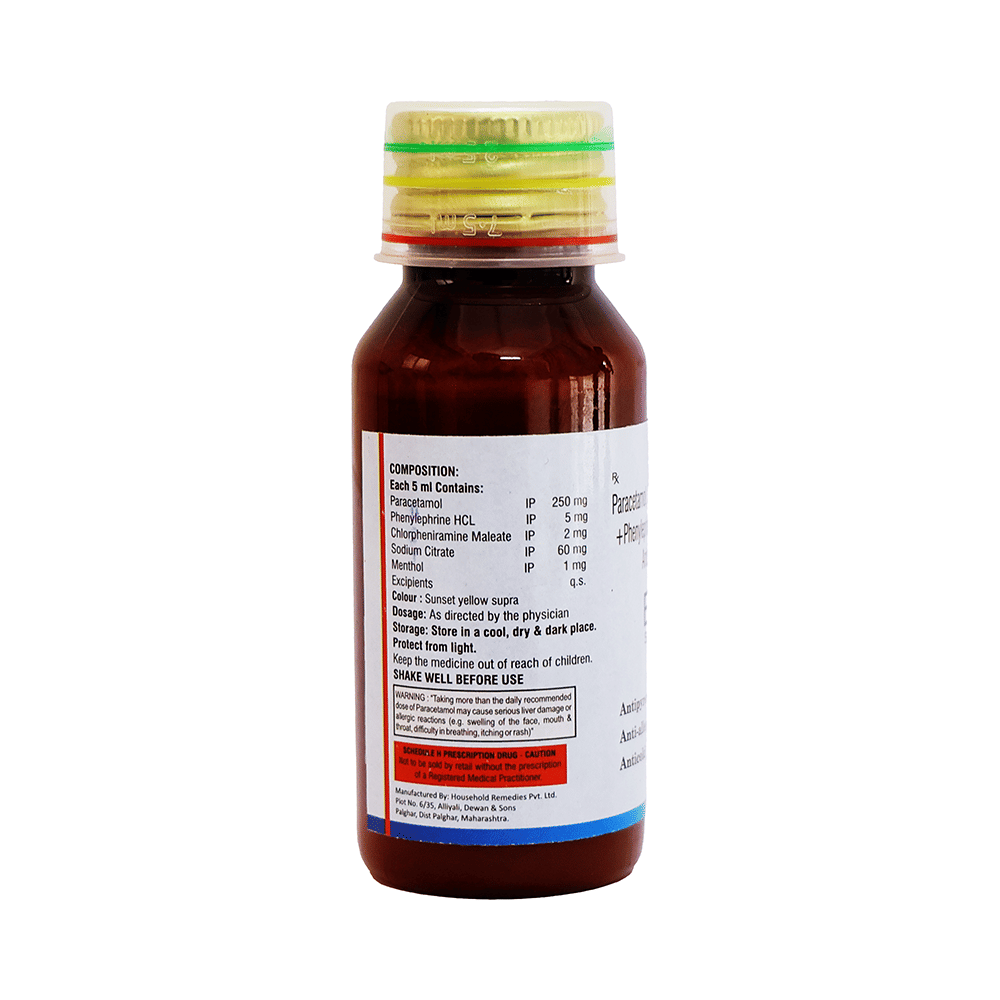 Salt Composition: Chlorpheniramine Maleate (2mg/5ml) + Paracetamol (250mg/5ml) + Phenylephrine (5mg/5ml) + Sodium Citrate (60mg/5ml) + Menthol (1mg/5ml)