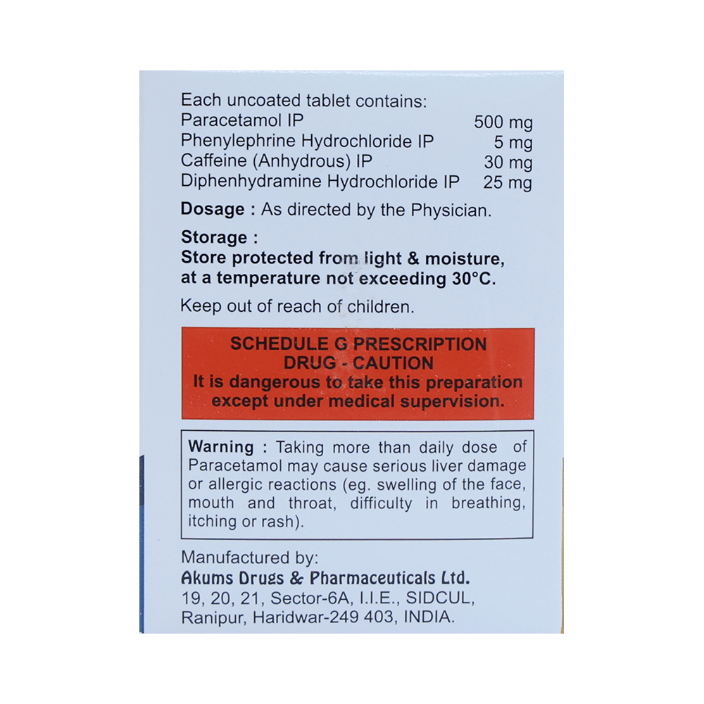Salt Composition: Caffeine (30mg) + Diphenhydramine (25mg) + Paracetamol (500mg) + Phenylephrine (5mg)