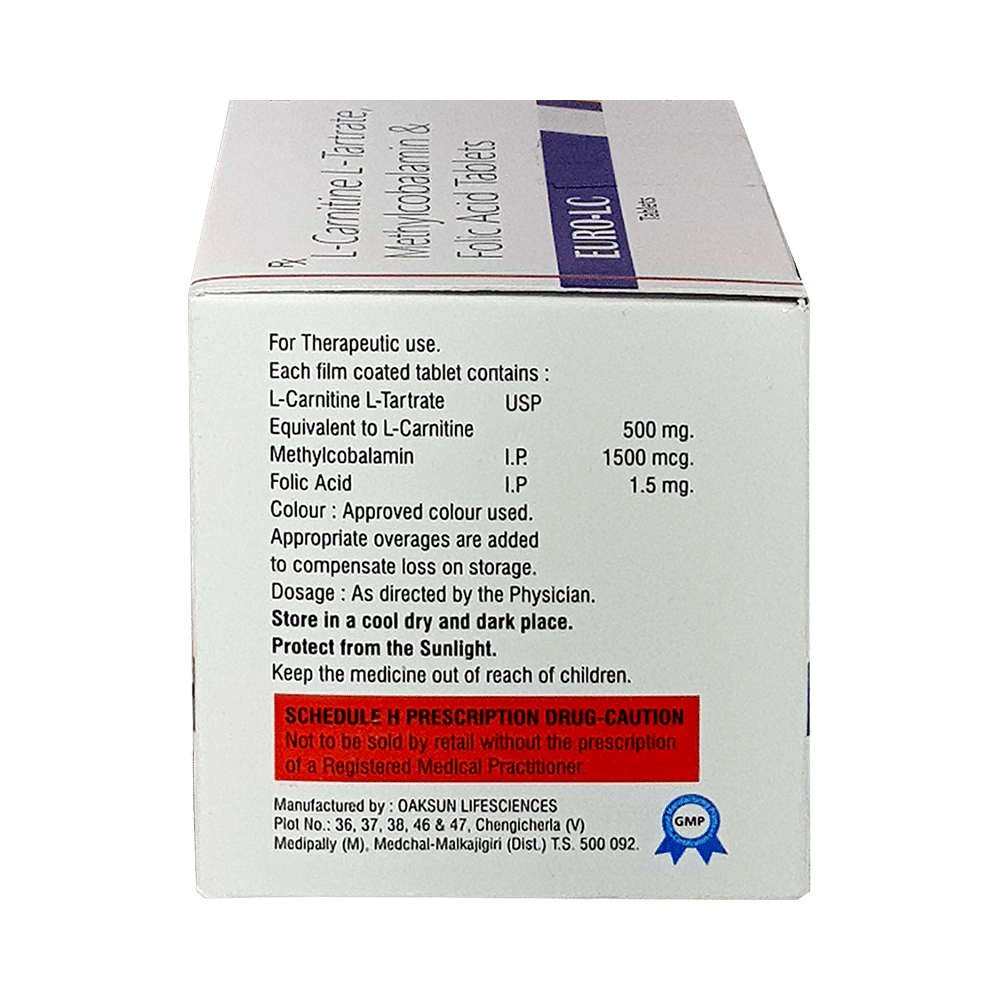 Euro-LC Tablet is a combination of vitamin B9, B12, L-carnitine L-tartrate. Folic acid is essential for production of red blood cells. It prevents and treats folate deficiency and anemia. When taken by pregnant women, Folic acid prevents miscarriage, preterm labor, and neural tube defects in infants. Levo-carnitine L-tartrate helps turn the fats present in ingested food into energy. It decreases insulin resistance and oxidative stress and improves immune function. Methylcobalamin corrects vitamin B12 deficiency thereby helping in treating certain anemias and nerve problems.