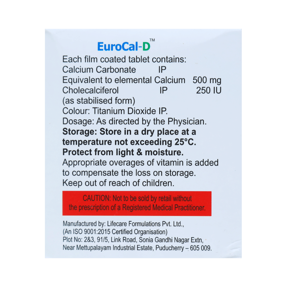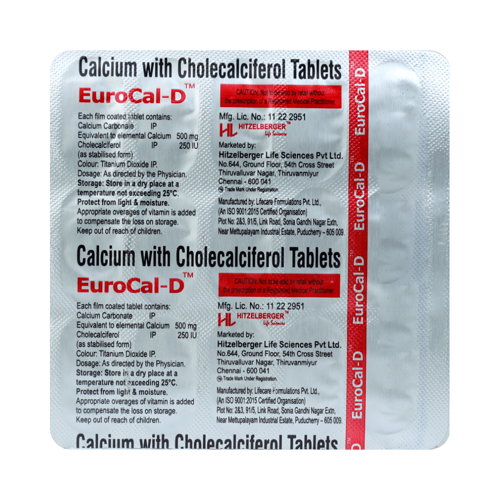 Eurocal-D Tablet is a nutritional supplement used in the treatment of calcium deficiency. It is prescribed when your diet alone cannot provide the necessary calcium your body needs. It increases the absorption of calcium and helps prevent or treat low blood calcium levels. Eurocal-D Tablet may be taken with or without food. Take it in the dose and duration advised by the doctor. Take it regularly at the same time each day to get maximum benefits from it. Do not take it more than or for longer than prescribed by the doctor, as that may cause harmful effects.There is limited data on the side effects of Eurocal-D Tablet. Let your doctor know if you experience any symptoms while taking Eurocal-D Tablet. They may be able to suggest ways to treat or manage the side effects.Before you start Eurocal-D Tablet, let your doctor know if you have any medical conditions. Let your doctor also know about all the medications you are taking, as some medicines may interact with Eurocal-D Tablet. Pregnant or breastfeeding women should consult their doctor before taking Eurocal-D Tablet to ensure safety.