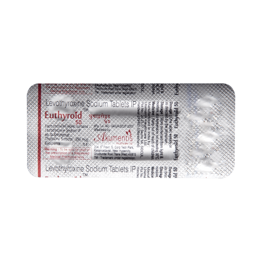 Euthyroid 50 Tablet is a synthetic version of a hormone produced by the thyroid gland. It works by replacing the thyroid hormones that your thyroid gland cannot produce in a sufficient quantity, and relieves the symptoms of hypothyroidism (tiredness, weight gain, and depression).