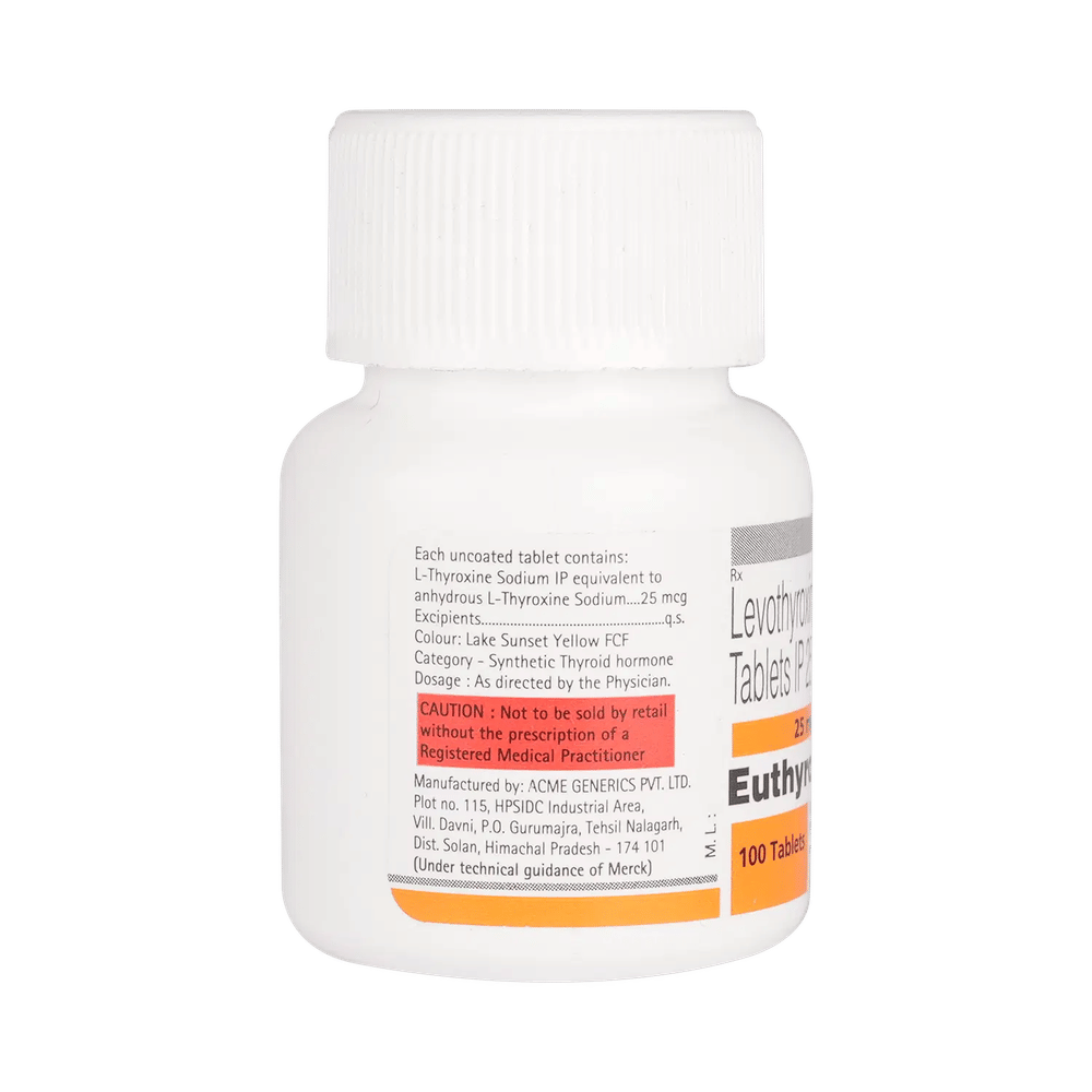 EUthyrox 25 Tablet is a synthetic version of a hormone produced by the thyroid gland. It works by replacing the thyroid hormones that your thyroid gland cannot produce. This leads to improved energy production, oxygen consumption, protein synthesis, and overall regulation of metabolism, helping restore normal thyroid function and physiological balance.