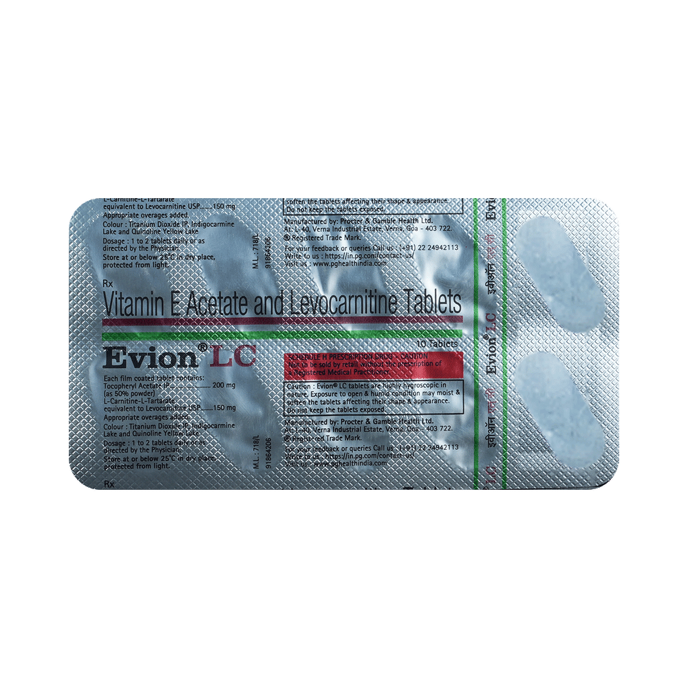 In Treatment of Muscle crampsEvion LC Tablet helps to improve muscle strength and also relieves pain and inflammation of the muscles. It contains antioxidants that prevent damage due to accumulation of harmful toxins called free radicals. This helps in treating muscle cramps effectively. Taking Evion LC Tablet can help you lead a better quality of life.In Treatment of Carnitine deficiencySymptoms of carnitine deficiency may include muscle weakness, fatigue, confusion, heart problems, liver dysfunction, and muscle pain. In severe cases, it can lead to heart conditions, liver problems, and other complications. Evion LC Tablet helps improve energy metabolism, protect against oxidative stress, enhance muscle function, support heart health, and promote metabolic balance in patients with carnitine deficiency.show moreshow less
