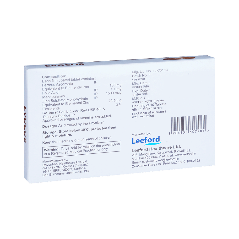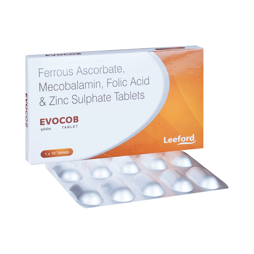 Evocob Tablet is a combination of vitamins and minerals. Ferrous Ascorbate consists of iron and vitamin C. Iron replenishes the iron stores in the body and corrects iron deficiency anemia. Vitamin C promotes the absorption of iron in the body. Folic acid is essential for production of red blood cells. It prevents and treats folate deficiency and anemia. When taken by pregnant women, Folic acid prevents miscarriage, preterm labor, and neural tube defects in infants. Methylcobalamin corrects vitamin B12 deficiency thereby helping in treating certain anemias and nerve problems. Zinc is needed for the body's immune system to work properly. It plays a role in growth, wound healing, and maintaining gut health. Zinc is also needed for the senses of taste and smell.