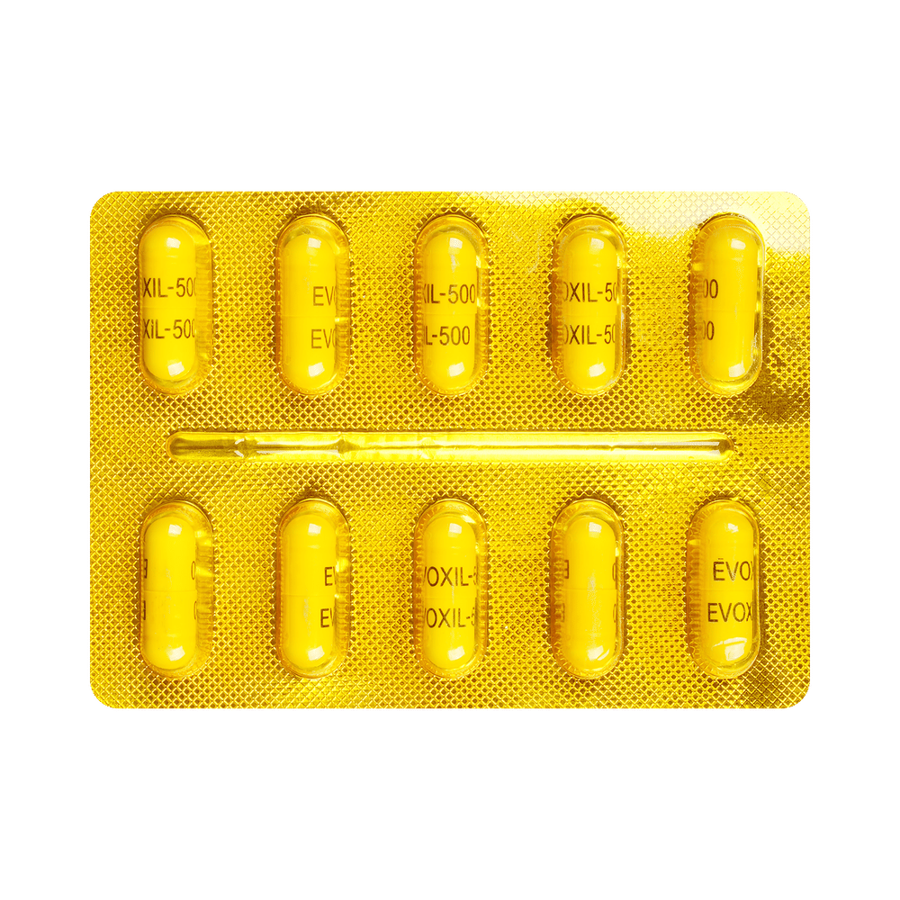 Evoxil 500mg Capsule is used to treat a variety of bacterial infections. It is effective in infections of the throat, ear, nasal sinuses, respiratory tract (e.g., pneumonia), urinary tract, skin and soft tissue, and typhoid fever. Additionally, Evoxil 500mg Capsule helps to eliminate a bacteria known as H. pylori in people with peptic ulcer disease. It is a broad-spectrum antibiotic that fights and stops the growth of many types of bacteria. This medicine is best taken with a meal to reduce the chance of a stomach upset. You should take it regularly at evenly spaced intervals as per the schedule prescribed by your doctor. Taking it at the same time every day will help you to remember to take it.Do not skip any doses and finish the full course of treatment even if you feel better. Stopping the medicine too early may lead to the infection returning or worsening. The total duration of treatment and precise dosage will be decided by your doctor, depending on the type of infection that you have and how well you respond to the medication.Before taking this medicine, inform your doctor if you are allergic to penicillin or any penicillin-type of medicine. Rash, vomiting, allergic reactions, nausea, and diarrhea may be seen as side effects in some patients. These are temporary and usually resolve quickly. Consult your doctor if any of these side effects persist or if your condition worsens. This medicine is generally regarded as safe to use during pregnancy if used under a doctor’s supervision.
