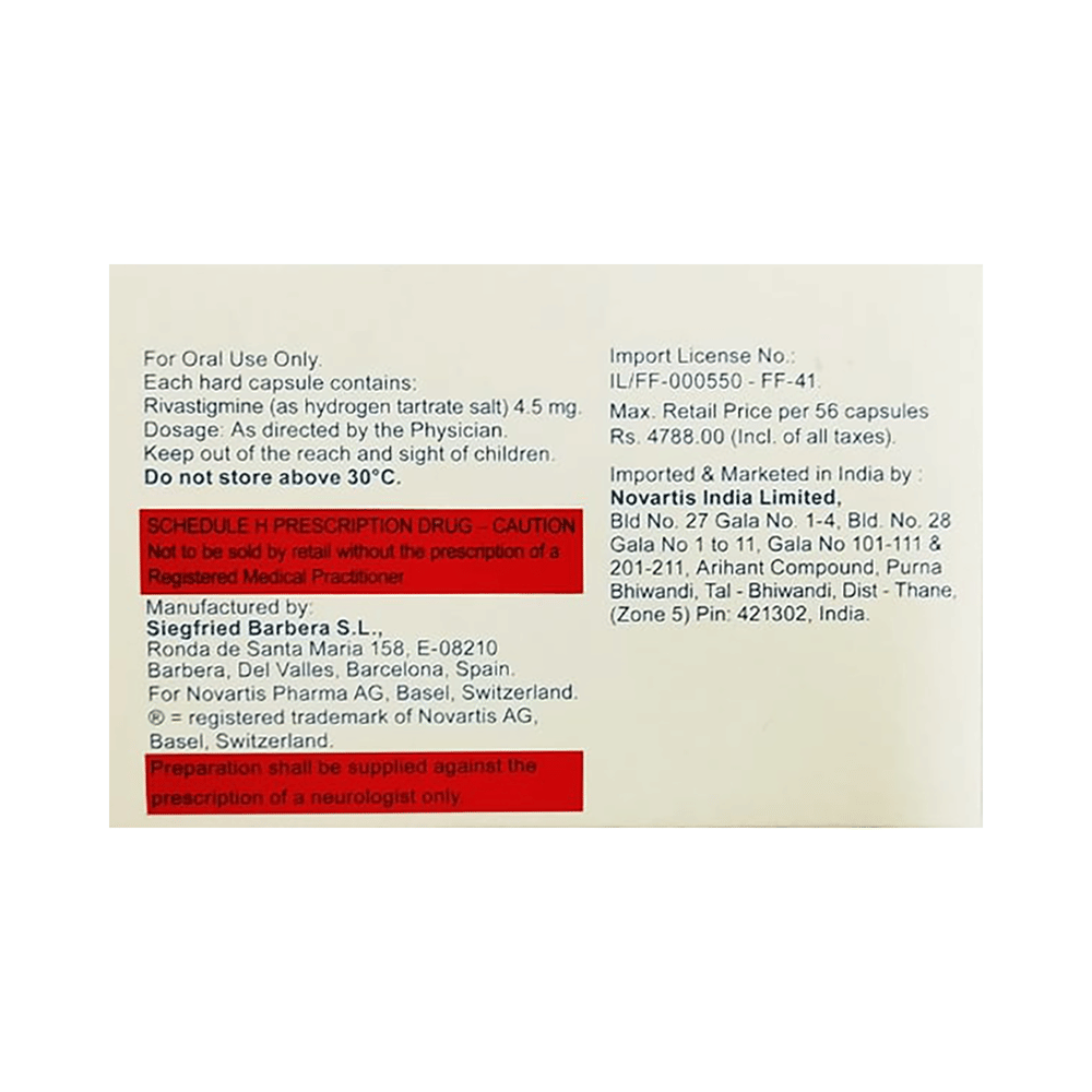 Take this medicine in the dose and duration as advised by your doctor. Exelon 4.5mg Capsule is to be taken with food.