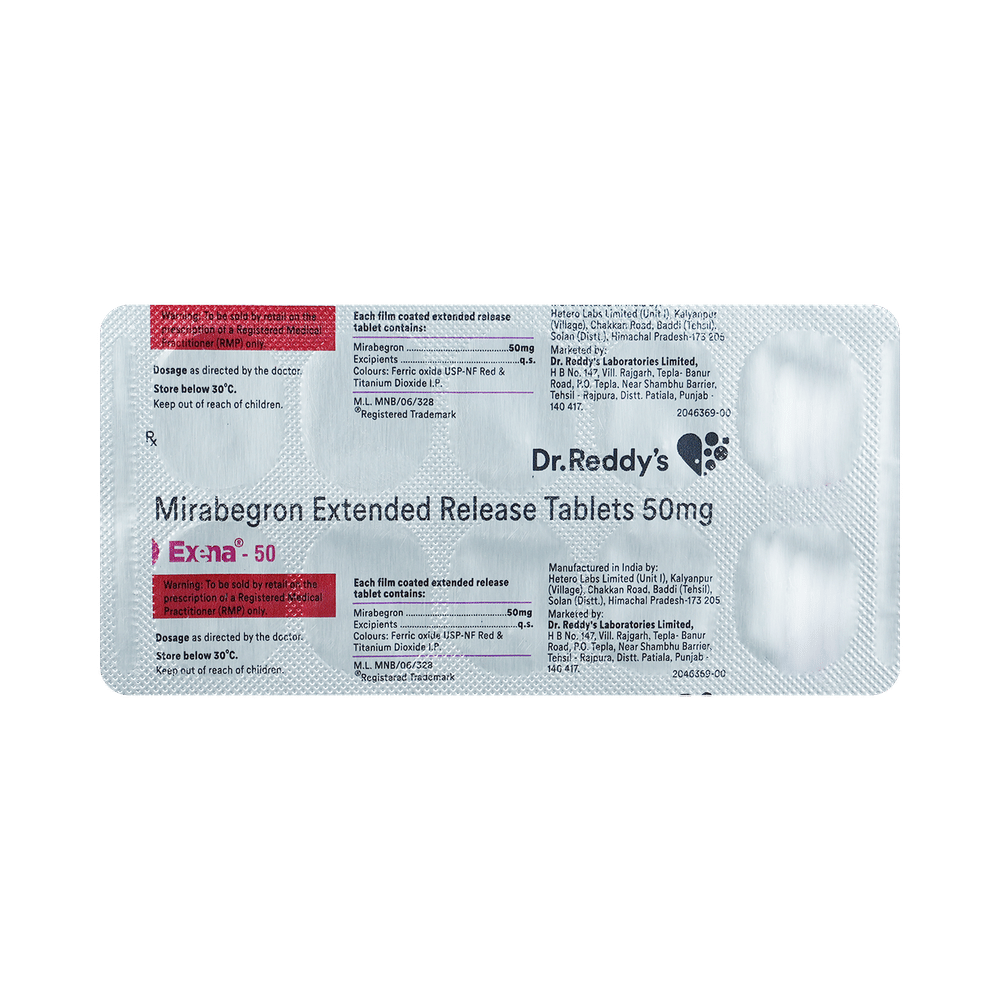 Exena 50 Tablet ER is a beta 3-receptor agonist. It works by activating the receptor in the bladder, causing the bladder muscles to relax. It prevents frequent, urgent or uncontrolled urination.