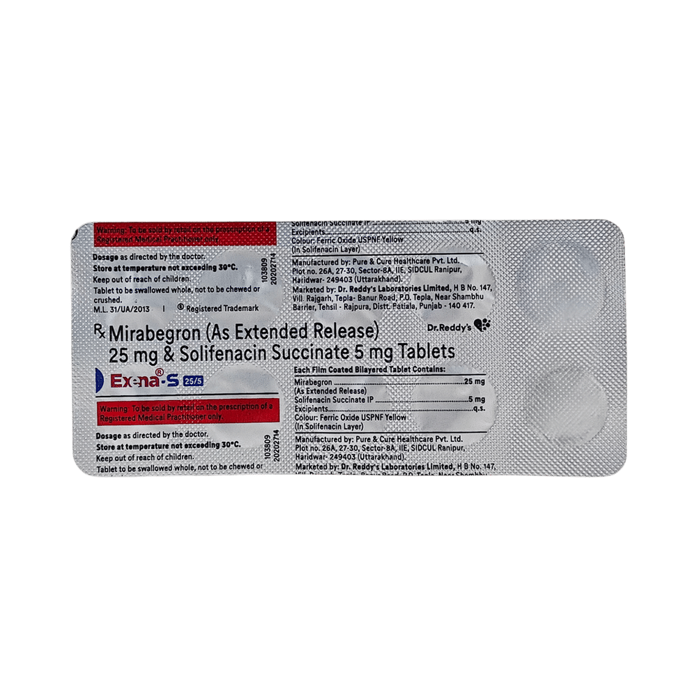 Exena S 25mg/5mg Tablet is a combination of two medicines: Mirabegron and Solifenacin. Mirabegron is a beta 3-receptor agonist. It works by activating the receptor in the bladder, causing the bladder muscles to relax. Solifenacin is an antimuscarinic. It also works by relaxing muscles of the urinary bladder. In this way, it works to prevent frequent, urgent, or uncontrolled urge of urination.