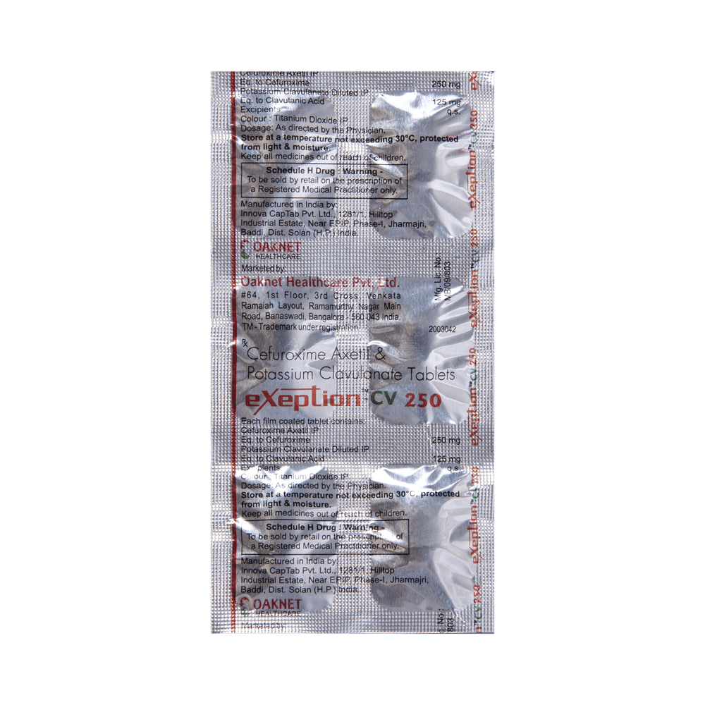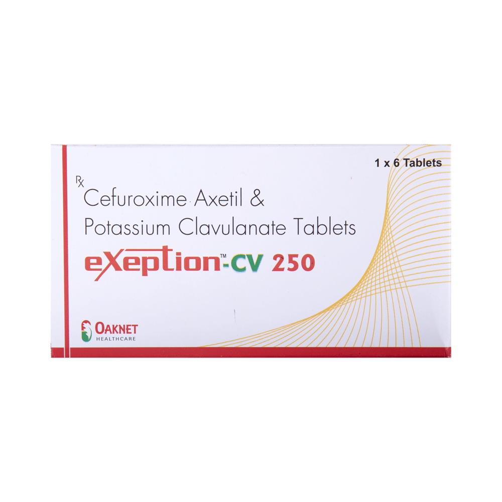 In Treatment of Bacterial infectionsExeption-CV 250 Tablet contains two different medicines, Cefuroxime and Clavulanic Acid, that work together to kill the bacteria that cause infections. Cefuroxime works by stopping the growth of bacteria. Clavulanic Acid reduces resistance and enhances the activity of Cefuroxime against bacteria.This combination medicine can be used to treat many different bacterial infections such as ear, sinus, throat, lung, urinary tract, skin and soft tissues. It usually makes you feel better within a few days, but you should continue taking it as prescribed even when you feel better to make sure that all bacteria are killed and do not become resistant.