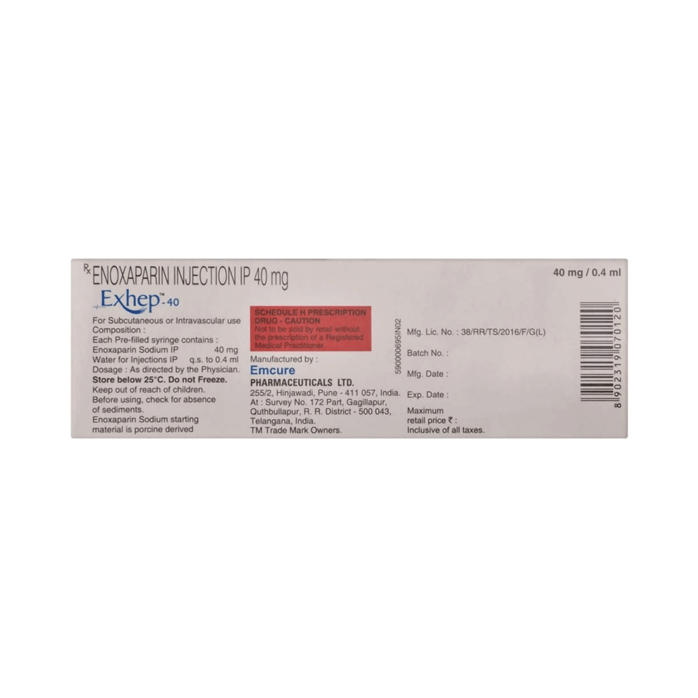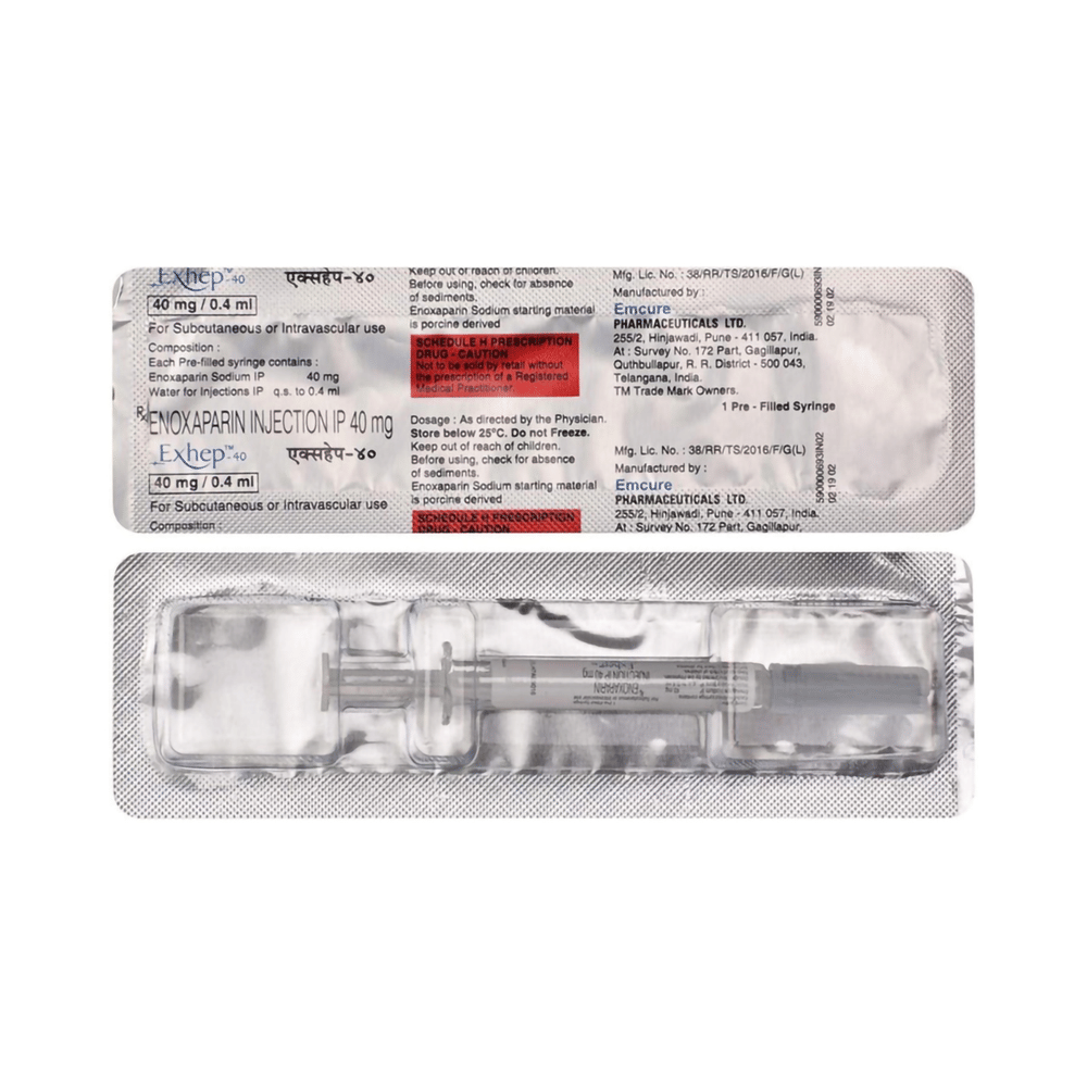 Exhep 40 Injection is an anticoagulant used to prevent and treat harmful blood clots. It stops the existing clots from getting any bigger and restricts the formation of any new clot. It is also helpful in the prevention of blood clots in veins, a condition called deep vein thrombosis, and pulmonary embolism. Exhep 40 Injection is injected under the skin by a doctor or nurse. It should not be injected into a muscle. The dose and length of treatment are based on your medical condition, your response to the medicine, and what you are being treated for. It may also be based on your age and weight. It is important to keep using this medicine even if you do not notice any symptoms because it is preventing future harm. If you stop taking it, you could get a blood clot. While taking this medicine you should avoid doing things that increase your risk of bleeding or injury.The most common side effect of this medicine include injection site pain, bleeding, headache, increased blood platelets, breathing problems, edema, anemia, fever, diarrhea, and increased liver enzymes. A severe headache could be a sign of bleeding in the brain. A severe stomach ache could be a sign of bleeding in the stomach. Bleeding can be dangerous and may not be obvious. Look out for symptoms and tell your doctor if you are worried.Before using this medicine, you should tell your doctor if you have high blood pressure, diabetes, or have had a recent stroke. You should not take it if you have any current bleeding. Some medicines should not be used with Exhep 40 Injection. Tell your doctor what else you are taking to make sure it is safe. If you have low body weight, you may be at increased risk of bleeding, and drinking alcohol can increase the risk of stomach bleeding.