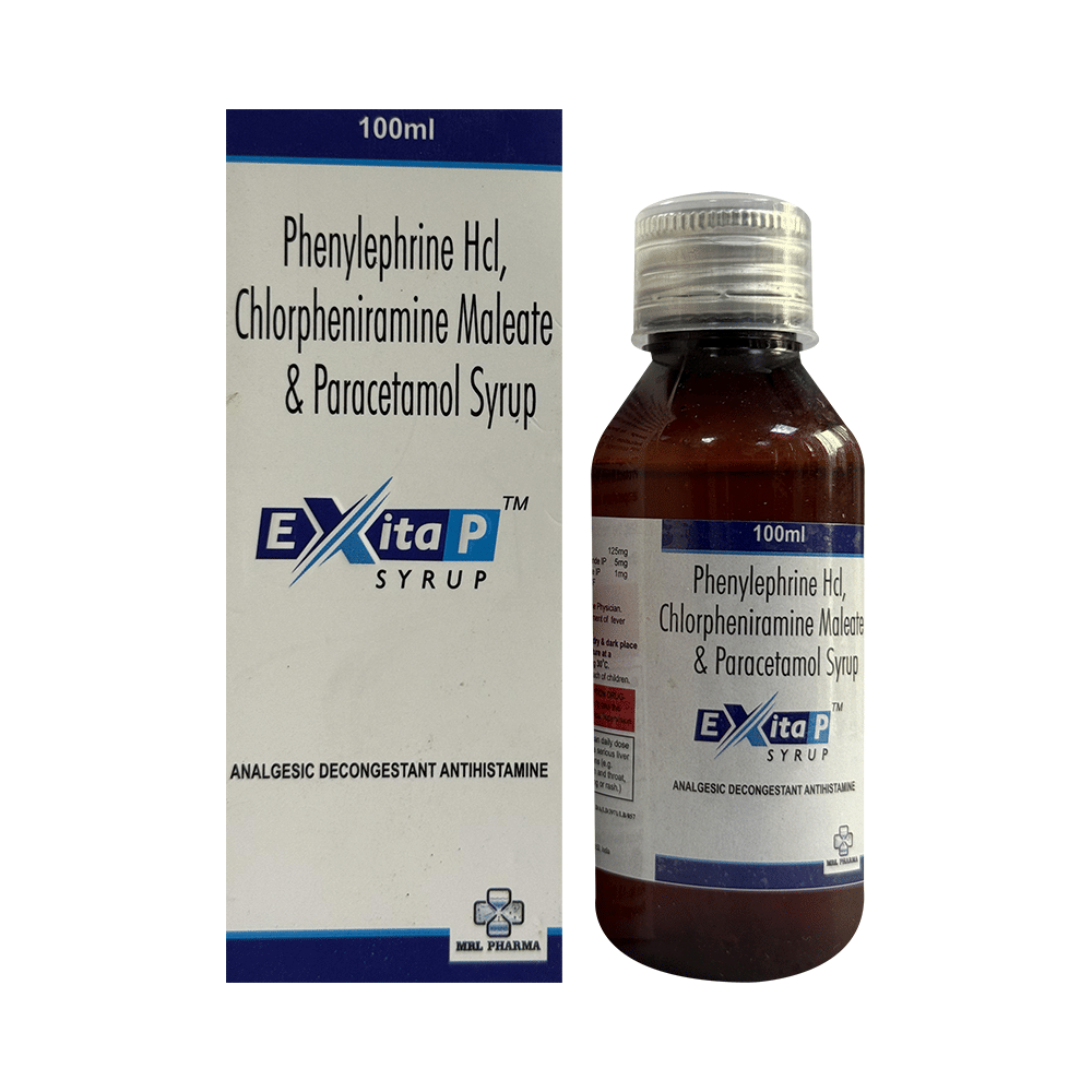 Exita P Syrup is a medicine used in the treatment of common cold symptoms. It provides relief from symptoms such as headache, sore throat, runny nose, muscular pain, and fever. Exita P Syrup can be taken with or without food. The dose and duration will depend on the severity of your condition. You should keep taking the medicine even if you feel better until the doctor says it is alright to stop using it.Using this medicine may cause a few common side effects such as nausea, vomiting, sleepiness, dizziness, and headache. If any of these side effects do not resolve with time or get worse, you should let your doctor know. Your doctor may be able to suggest ways of preventing or reducing the side effects. In general, you should try to use the smallest amount necessary to control your symptoms.Before using the medicine, you should tell your doctor if you have any other medical conditions or disorders. To make sure it is safe, you should let your doctor know all the other medicines you are taking. Also, tell your doctor if you have any problems with the liver or kidneys. Avoid consumption of alcohol while on treatment with this medicine as it may increase the chance of some side effects. Pregnant and breastfeeding women should consult their doctors first before using the medicine.
