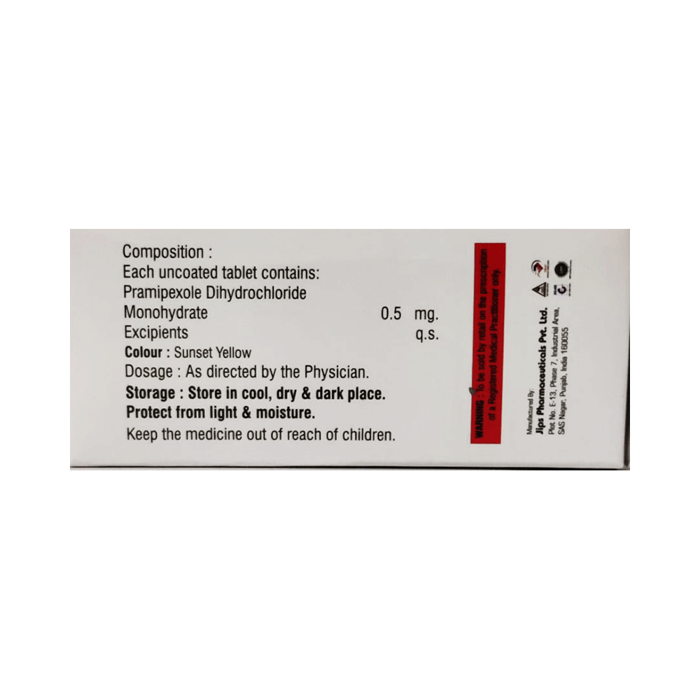 Exolem 0.5 Tablet is used in the treatment of Parkinson's disease and restless leg syndrome (an urge to move the legs usually accompanied or caused by uncomfortable and unpleasant leg sensations). It helps to treat excessive shaking by slowing down the body movements. Exolem 0.5 Tablet should be taken with food. However, take it at the same time each day as this helps to maintain a consistent level of medicine in the body. Take this medicine in the dose and duration as advised by your doctor and if you have missed a dose, take it as soon as you remember it. You should never skip any doses and finish the full course of treatment even if you feel better. This medication must not be stopped suddenly without talking to your doctor.Some common side effects of this medicine include nausea, dry mouth, fatigue, hallucinations, constipation, and peripheral edema. It also causes dizziness and sleepiness, so do not drive or do anything that requires mental focus until you know how this medicine affects you. Inform your doctor if you develop any unusual changes in mood, an abnormally high sex drive, an urge to gamble, or uncontrolled spending as these may prove very harmful.