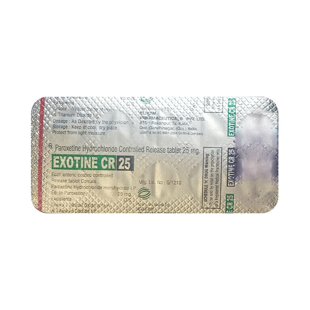 Exotine CR 25 Tablet is a type of antidepressant belonging to the selective serotonin reuptake inhibitor (SSRI) group of medicines. It is widely prescribed to treat depression and anxiety-related conditions like obsessive-compulsive disorder, and panic disorder. Exotine CR 25 Tablet helps many people to recover from depression by improving their mood and relieving anxiety and tension. It can be taken with or without food. The dose and how often you need it will be decided by your doctor so that you get the right amount to control your symptoms.Your doctor may start you on a lower dose and increase it gradually. Do not change the dose or stop taking it without talking to your doctor, even if you feel well. Doing so may make your condition worse or you may suffer from unpleasant withdrawal symptoms (anxiety, restlessness, palpitations, dizziness, sleep disturbances, etc).To get the most benefit, take this medicine regularly at the same time each day. Your doctor may advise you to take it in the morning if you have trouble sleeping. It may take a few weeks before you start feeling better. Let your doctor know if you do not see any improvement even after 4 weeks.Some common side effects of Exotine CR 25 Tablet include nausea, fatigue, dry mouth, loss of appetite, increased sweating, dizziness, nervousness, tremors, insomnia (difficulty in sleeping), and constipation. Sexual side effects like decreased sexual drive, delayed ejaculation, and erectile dysfunction may also be seen. Let your doctor know straight away if you develop any sudden worsening of mood or any thoughts about harming yourself.Before taking this medicine, you should tell your doctor if you have epilepsy (seizure disorder or fits), diabetes, liver or kidney disease, heart problems, or glaucoma. These may affect your treatment. Pregnant or breastfeeding women should also consult their doctor before taking it. Some other medicines may affect the way it works, especially other antidepressants and medicines called MAO inhibitors. Please tell your doctor about all the medicines you are taking to make sure you are safe.