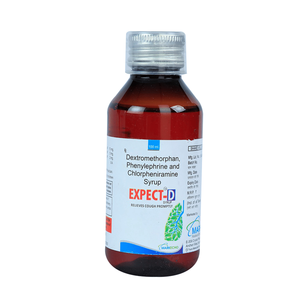 Expect-D Syrup is a combination of three medicines: Phenylephrine, Chlorpheniramine Maleate, and Dextromethorphan Hydrobromide. Phenylephrine is a decongestant which narrows the small blood vessels providing relief from congestion or stuffiness in the nose. Chlorpheniramine Maleate is an antiallergic which relieves allergy symptoms like runny nose, watery eyes and sneezing. Dextromethorphan Hydrobromide is a cough suppressant which relieves cough by reducing the activity of cough center in the brain.