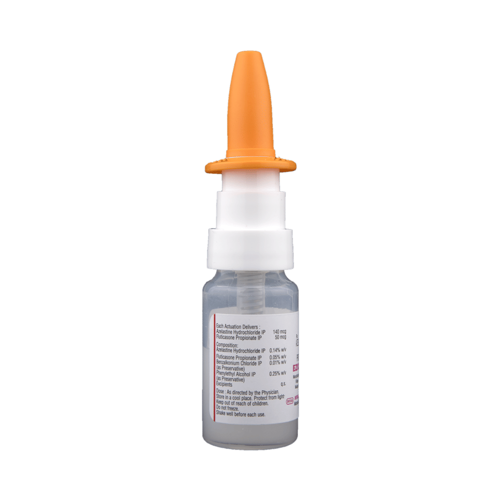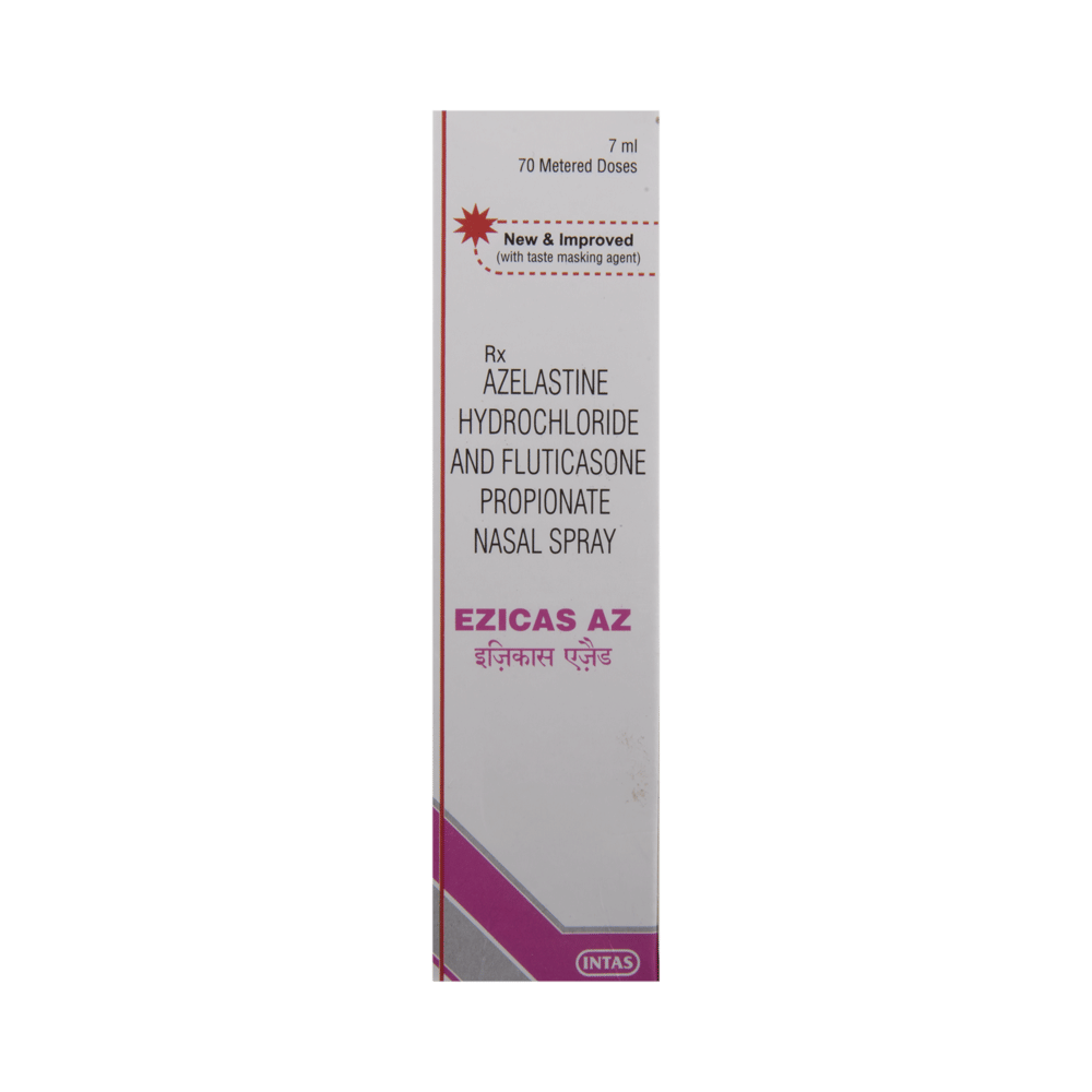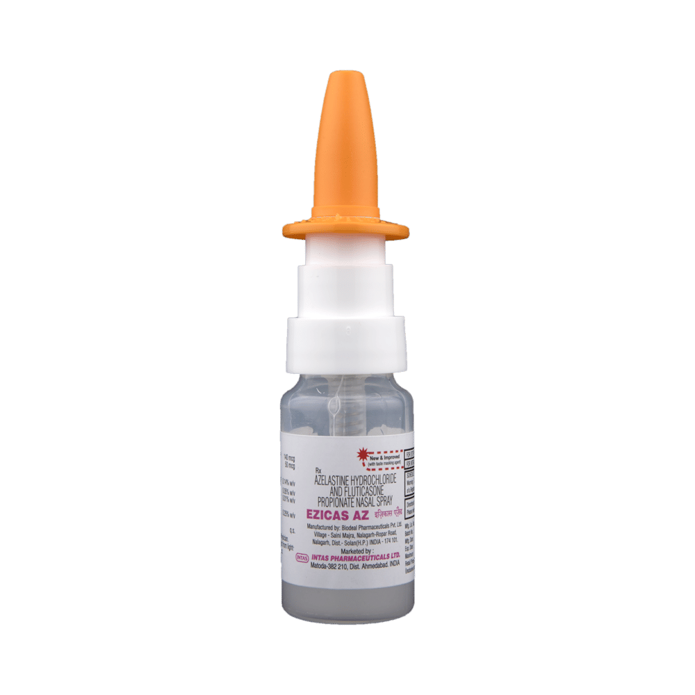 Ezicas AZ Nasal Spray is a combination of two medicines: Fluticasone Propionate and Azelastine, which relieves sneezing and runny nose caused due to allergies (allergic rhinitis). Fluticasone Propionate is a steroid which works by blocking the release of certain chemical messengers that cause inflammation (swelling) and irritation in the nose. Azelastine is an antiallergic which relieves allergy symptoms like runny nose, watery eyes and sneezing.