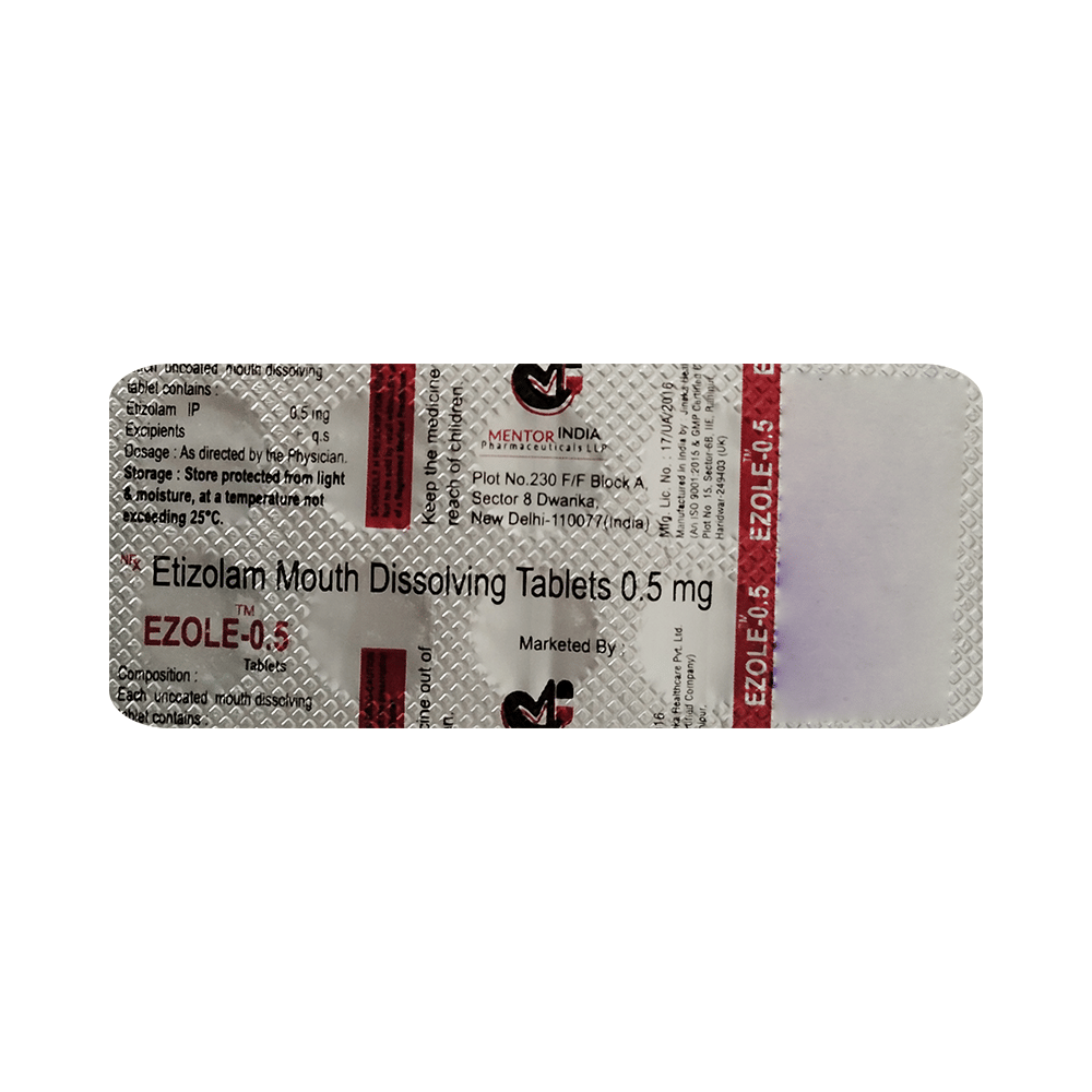 In Treatment of InsomniaEzole 0.5 Tablet MD helps treat insomnia (difficulty falling or staying asleep) in people who have problems related to their sleeping habits. Insomnia may cause you to wake up earlier than usual and you may find it difficult to go back to sleep. Ezole 0.5 Tablet MD works by slowing activity in the brain to allow sleep. This helps you relax and feel more energetic. It also helps you concentrate better and improves your quality of life.In Treatment of Short term anxietyEzole 0.5 Tablet MD reduces the symptoms of excessive anxiety and worry that are triggered only at the time of stressful conditions that last for a shorter duration. These could be job interviews, exams, stage performances, etc. It can effectively manage feelings of restlessness, tiredness, difficulty concentrating and feeling irritable. Ezole 0.5 Tablet MD will therefore help you go about your daily activities more easily and be more productive. Keep taking this medicine even if you feel well. Stopping suddenly can cause serious problems.show moreshow less