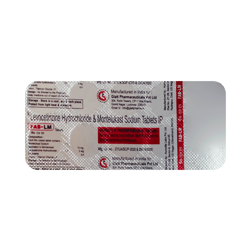 Fab-LM Tablet is a combination of two medicines: Levocetirizine and Montelukast, which relieves sneezing and runny nose due to allergies. Levocetirizine is an antiallergic which blocks a chemical messenger (histamine) responsible for runny nose, watery eyes and sneezing. Montelukast is a leukotriene antagonist. It works by blocking another chemical messenger (leukotriene). This reduces inflammation (swelling) in the airways and nose, and improves symptoms.