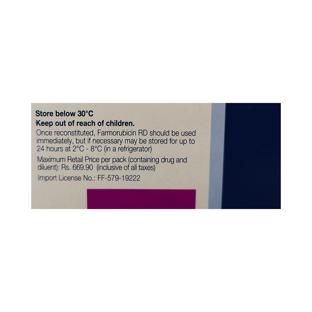 Farmorubicin RD 10mg Injection is used in the treatment of various types of cancers of blood, breast, stomach, lung, ovaries and soft tissues. It also helps to prevent the recurrence of bladder cancer after surgery. It is given as a drip or infusion vein with extreme caution by a qualified medical professional. It can be used alone, or sometimes given together with certain other medicines as part of combination chemotherapy. Your doctor will decide what dose is necessary and how often you need to take it. This will depend on what you are being treated for and may change from time to time. You should take it exactly as your doctor has advised. Taking it in the wrong way or taking too much can cause very serious side effects. It may take several weeks or months for you to see or feel the benefits but do not stop taking it unless your doctor tells you to. It makes contraceptive pills less effective, so it advised to both male and female to use reliable contraception during the treatment.The most common side effects of this medicine include nausea, low blood platelets, hair loss, absence of menstrual periods, fever and rash. It is known to reduce the number of blood cells in your blood thereby, increasing the susceptibility to infections. Infections can sometimes be life threatening. Regular blood tests are required to monitor your blood cells along with kidney, liver and heart function during treatment with this medicine.Before taking this medicine, tell your doctor if you have liver disease, or have heart problem. Your doctor should also know about all other medicines you are taking as many of these may make this medicine less effective or change the way it works. Inform your doctor if you are pregnant or breastfeeding.