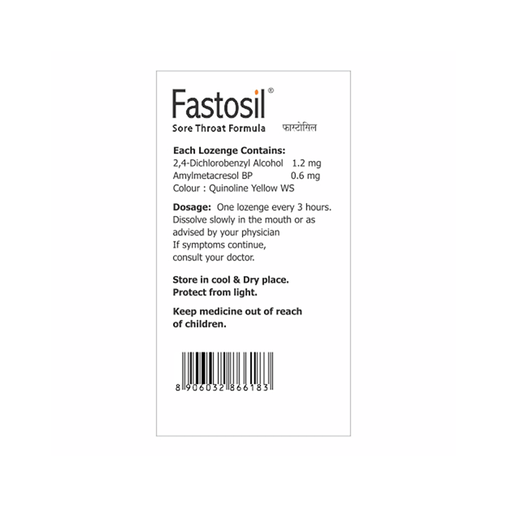 Fastosil Lozenges Honey Lemon is a combination of medicines used to treat a sore throat. It kills the bacteria associated with throat infections. Additionally, it helps reduce inflammation, relieves pain, and soothes irritation in the throat. Take Fastosil Lozenges Honey Lemon in the dose and duration as advised by the doctor. Do not take more than the recommended dose, as exceeding the prescribed amount may lead to unwanted side effects or reduced effectiveness. Take it regularly and take it for as long as the doctor has prescribed.This medicine has minimal or no side effects, making it generally well-tolerated. However, in rare cases, some individuals may experience mild symptoms such as nausea, vomiting, or stomach discomfort. If you experience any of these symptoms or any other unusual reactions that you think are because of this medicine, please consult your doctor.Inform your doctor if you are taking any other medicine to avoid potential interactions. Additionally, inform your doctor if you have any known allergies to this medicine or any of its components. If you are pregnant, breastfeeding, or suffering from any other underlying health conditions such as liver or kidney disease, it is important to discuss these factors with your doctor before starting this medication to ensure its safety and suitability for you.