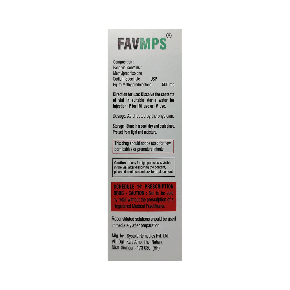 Favmps 500mg Injection is a type of medicine called a steroid. It is used to treat different conditions including rheumatic disorder, asthma, severe allergic reactions and conditions that affect your eyes and skin. Favmps 500mg Injection is usually given as an injection by your doctor into a vein, joint, or muscle. The amount you are given will depend on what you are being treated for and how much you need to control your symptoms. If you are using this medication at home, learn exactly how to do it correctly from your doctor. You should always take the amount prescribed. Do not take a larger dose or use it more often. Taking a higher dose will not improve your condition faster, and your risk of side effects will increase. Keep taking it regularly even if you feel well. Do not suddenly stop this medication as your condition may become worse. It should always be stopped gradually.The most common side effects of this medicine include nausea, headache, dizziness, sweating, and swelling in your hands or ankles (edema). If these side effects bother you or will not go away, your doctor may suggest ways of preventing or reducing them. Steroids may also lower your ability to fight infections so avoid being near people who might pass on infections such as measles, chickenpox, or flu. Do not receive a live vaccine while using this medicine. Steroids can affect growth in children.Before using this medicine, you should tell your doctor if you have brittle bones (osteoporosis), mood disorders, high blood pressure, or liver disease. Also, tell your doctor if you have diabetes, this medicine may increase blood glucose levels which can worsen diabetes. Many other drugs may affect, or be affected by, this medicine so let your doctor know all other medicines you are using. This is done to make sure it is safe to use. You should also tell your doctor if you are pregnant, planning to become pregnant or breastfeeding. If this medicine is used for a long time you will be asked for regular monitoring of blood sugar, blood pressure, bone density as well as an eye examination.