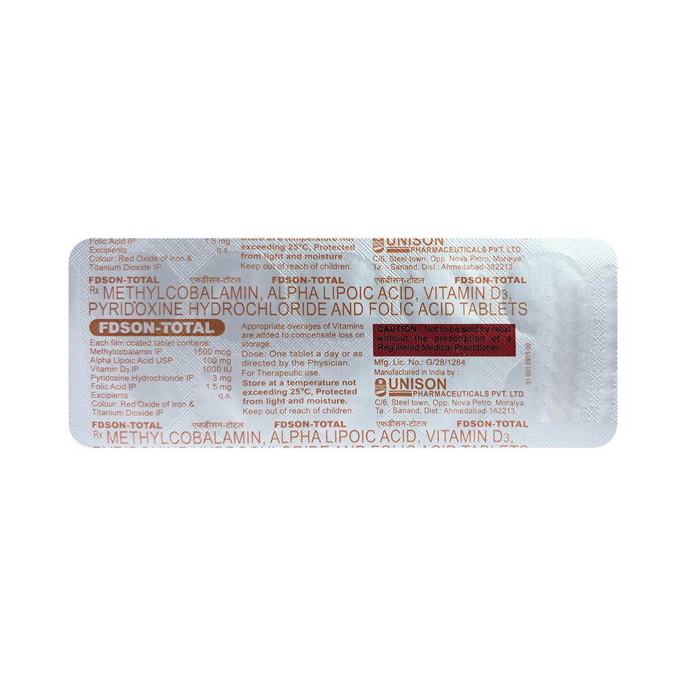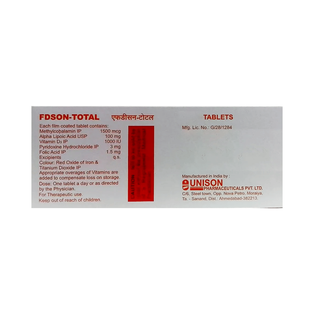 Fdson-Total Tablet is a combination of five nutritional supplements. Methylcobalamin is an active form of Vitamin B 12. This helps in proper cell growth and development, helps in protein synthesis and production of blood cells (red and white blood cells). Alpha Lipoic Acid is an antioxidant that repairs cell damage and restores vitamin level in the body, it also improves the functions of the nerves. Vitamin B6 (Pyridoxine) and Vitamin D3 are vitamin nutritional supplements that regulate essential metabolic functions in the body for proper growth and development. Folic Acid is also known as folate or vitamin B9. It helps in producing blood (hemoglobin) in the body. This is how it works in the treatment of nutritional deficiencies.