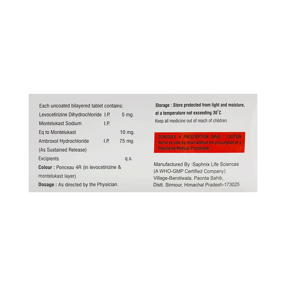 Salt Composition: Ambroxol (75mg) + Levocetirizine (5mg) + Montelukast (10mg)
