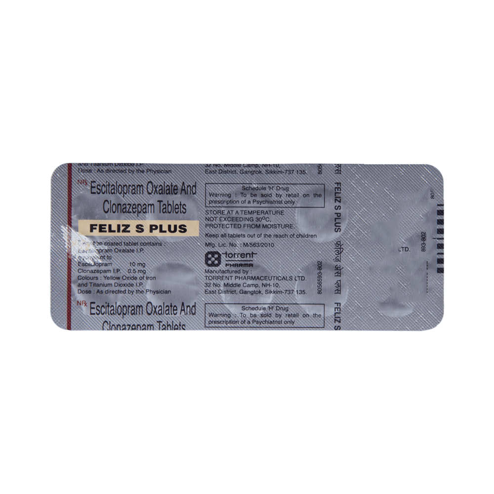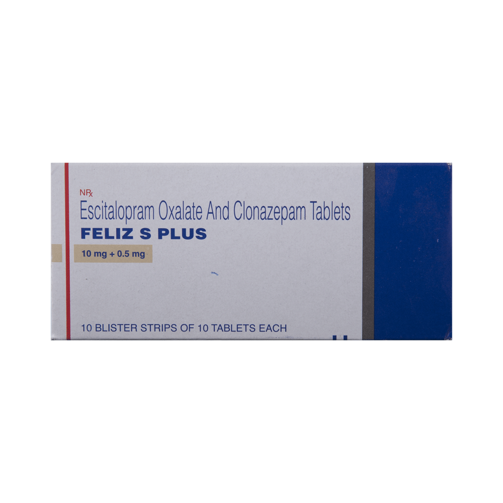 Feliz S Plus Tablet is a prescription medicine used to treat anxiety disorder. It is the combination medicine that calms the brain by decreasing the abnormal and excessive activity of the nerve cells. It also works by increasing the level of a chemical messenger in the brain which improves mood. Feliz S Plus Tablet can be taken with or without food. However, it is advised to take it at the same time each day as this helps to maintain a consistent level of medicine in the body. Take this medicine in the dose and duration advised by your doctor as it has habit-forming potential. If you miss a dose of this medicine, take it as soon as you remember. Finish the full course of treatment even if you feel better. It is important not to stop taking this medicine suddenly as it may cause withdrawal symptoms.Some common side effects of this medicine include delayed ejaculation, low sexual desire, vomiting, memory impairment, depression, and confusion. It may also cause dizziness and sleepiness. So, do not drive or do anything that requires mental focus until you know how this medicine affects you. It may cause weight gain or weight loss depending upon person to person. To prevent weight gain, you can eat a balanced diet and exercise regularly. On the other hand, weight loss can be prevented by increasing food portions in your diet. It is important to inform your doctor if you develop any unusual changes in mood as it can cause suicidal thoughts.Take caution while taking medicine if you are suffering from liver disease. Your doctor should also know about all other medicines you are taking as many of these may make this medicine less effective or change the way it works. Inform your doctor if you are pregnant, planning pregnancy or breastfeeding.