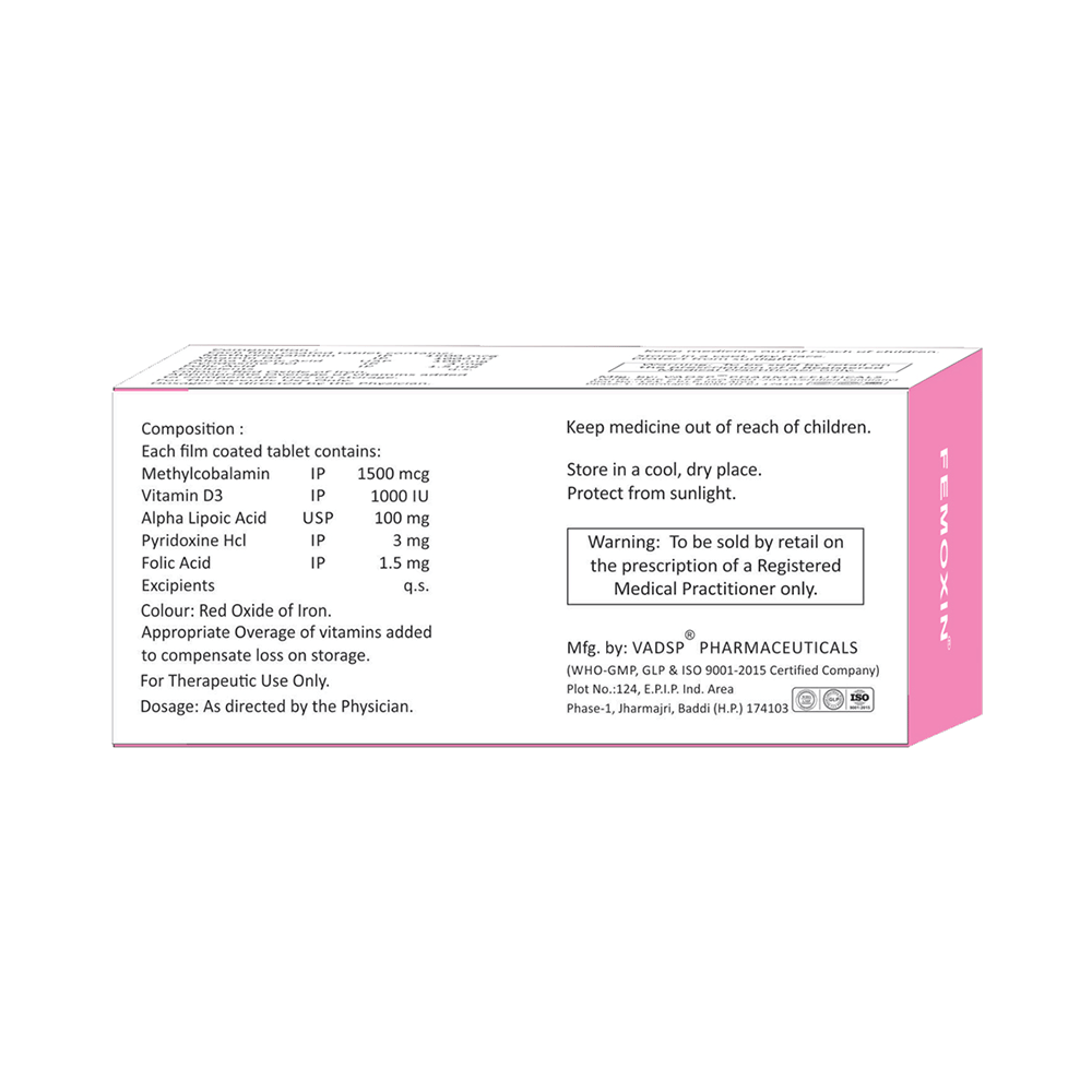 Femoxin Tablet is a combination of five nutritional supplements. Methylcobalamin is an active form of Vitamin B 12. This helps in proper cell growth and development, helps in protein synthesis and production of blood cells (red and white blood cells). Alpha Lipoic Acid is an antioxidant that repairs cell damage and restores vitamin level in the body, it also improves the functions of the nerves. Vitamin B6 (Pyridoxine) and Vitamin D3 are vitamin nutritional supplements that regulate essential metabolic functions in the body for proper growth and development. Folic Acid is also known as folate or vitamin B9. It helps in producing blood (hemoglobin) in the body. This is how it works in the treatment of nutritional deficiencies.