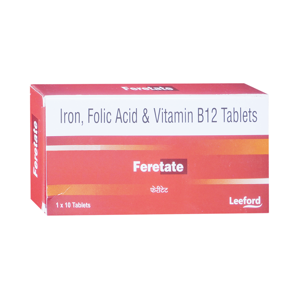 Feretate Tablet is a combination of two nutritional supplements. It is used to treat Iron deficiency anemia. Feretate Tablet can be taken with or without food. It should be used in the dose and duration as prescribed by your doctor. It is advised to take this medicine at a fixed time. This medicine should not be consumed more than the recommended dose.This is usually a safe medicine with very minimal side effects. Contact your doctor immediately if you notice any symptoms of allergic reactions like swelling, itching, difficulty in breathing, hives, etc.Before taking this medicine, tell your doctor if you have any other health conditions. Inform your doctor if you are taking any other medicines or if you are pregnant or breastfeeding. It is advised not to consume alcohol after taking this medicine.