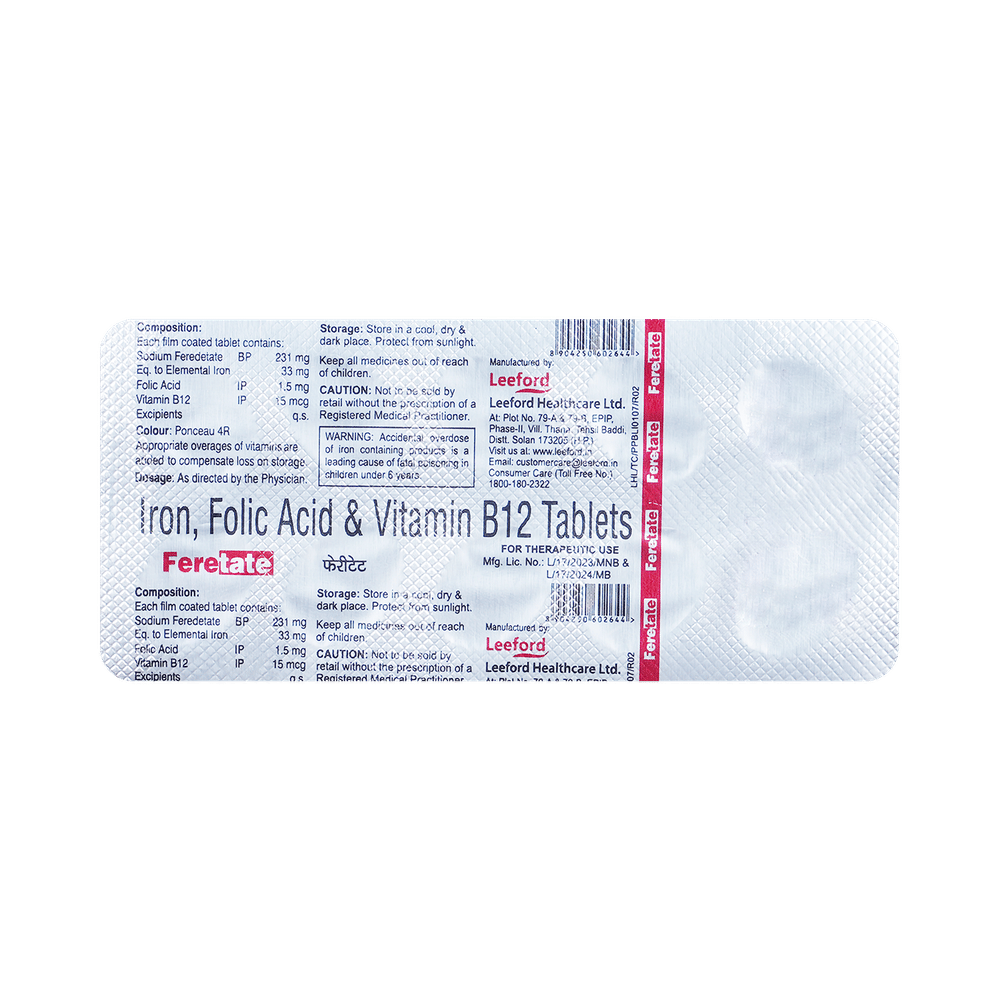 Feretate Tablet is a combination of two medicines: Sodium Feredetate and Folic Acid. Sodium Feredetate works by replenishing the iron stores in your body. Iron is vital for formation of new red blood cells and hemoglobin, a substance that gives these cells the ability to transport oxygen. Folic Acid is a form of vitamin B. It plays a vital role in the formation of red blood cells, which carry oxygen throughout the body. It also contains vitamin B12, that restores its level in the body thereby helping in treating certain anemias and nerve problems.