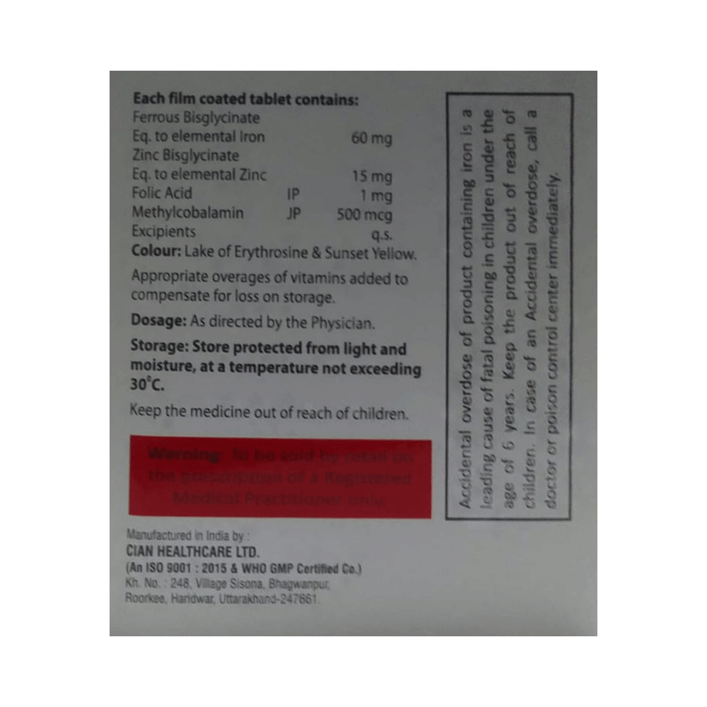 Salt Composition: Ferrous Ascorbate (60mg) + Folic Acid (1mg) + Methylcobalamin (500mcg) + Zinc (15mg)