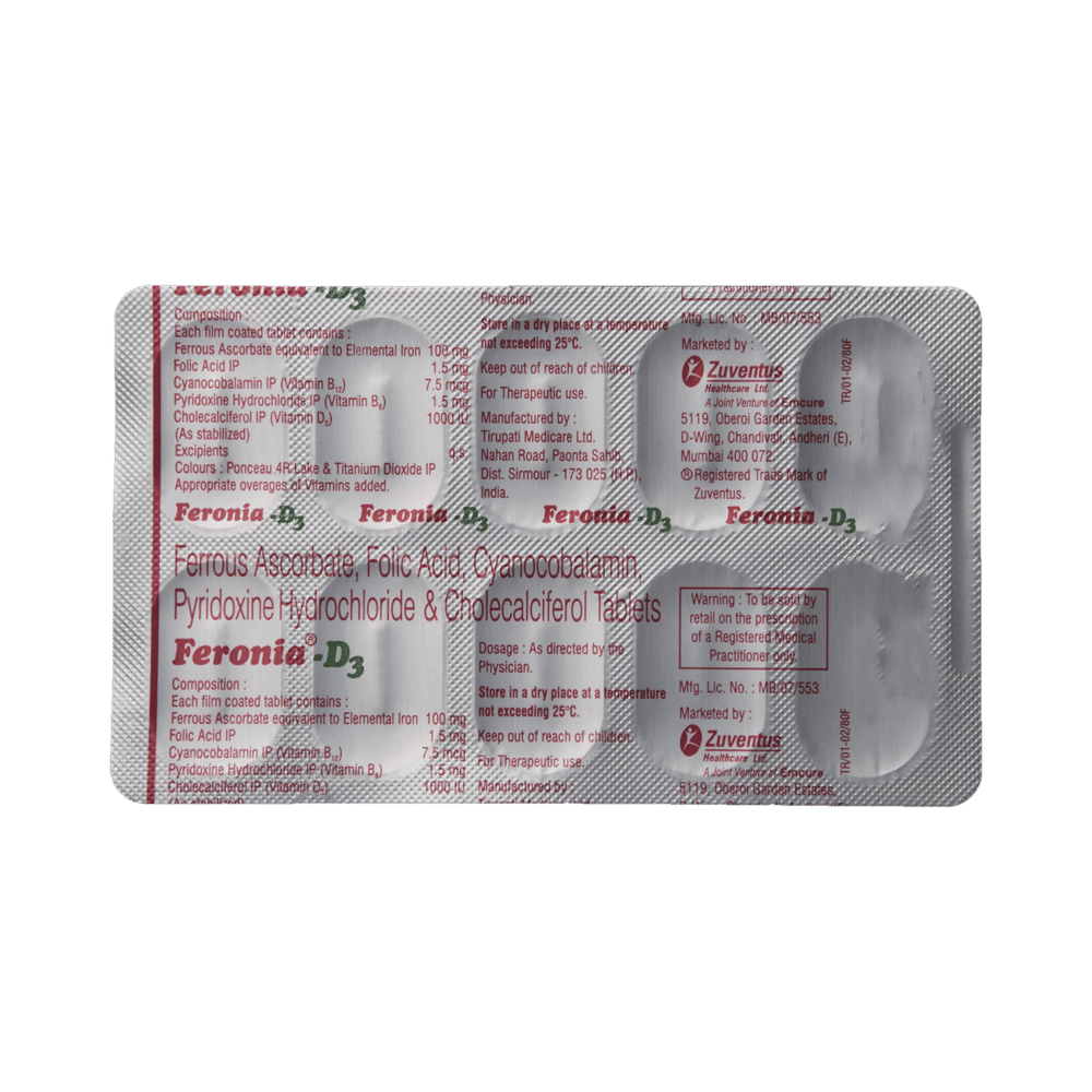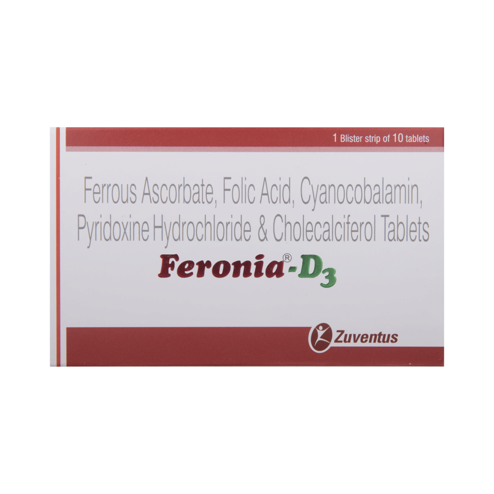 Feronia -D3 Tablet is a combination of five medicines: Ferrous Ascorbate, Vitamin D3, Folic Acid, Vitamin B12, and Pyridoxine. Ferrous Ascorbate is a combination of iron and vitamin C. Iron works by replenishing the iron stores in your body and corrects iron deficiency anemia. Vitamin C (ascorbate) is added to enhance the absorption of iron in the body. Vitamin D3 is a form of vitamin D. It raises vitamin D levels in your blood. This in turn raises calcium levels in your blood by helping you absorb more calcium from food. Folic Acid is a form of vitamin B. It plays a vital role in the formation of red blood cells, which carry oxygen throughout the body. It is also essential in pregnancy due to its role in the development of the unborn baby's brain and spinal cord. Vitamin B12 is a nutritional supplement that helps in treating certain anemias and nerve problems. Pyridoxine is a nutritional supplement that possesses anti-nausea properties and helps in proper functioning of nerves.