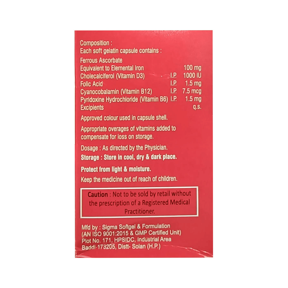 Salt Composition: Ferrous Ascorbate (100mg) + Vitamin D3 (1000IU) + Folic Acid (1.5mg) + Vitamin B12 (7.5mcg) + Pyridoxine Hydrochloride (1.5mg)